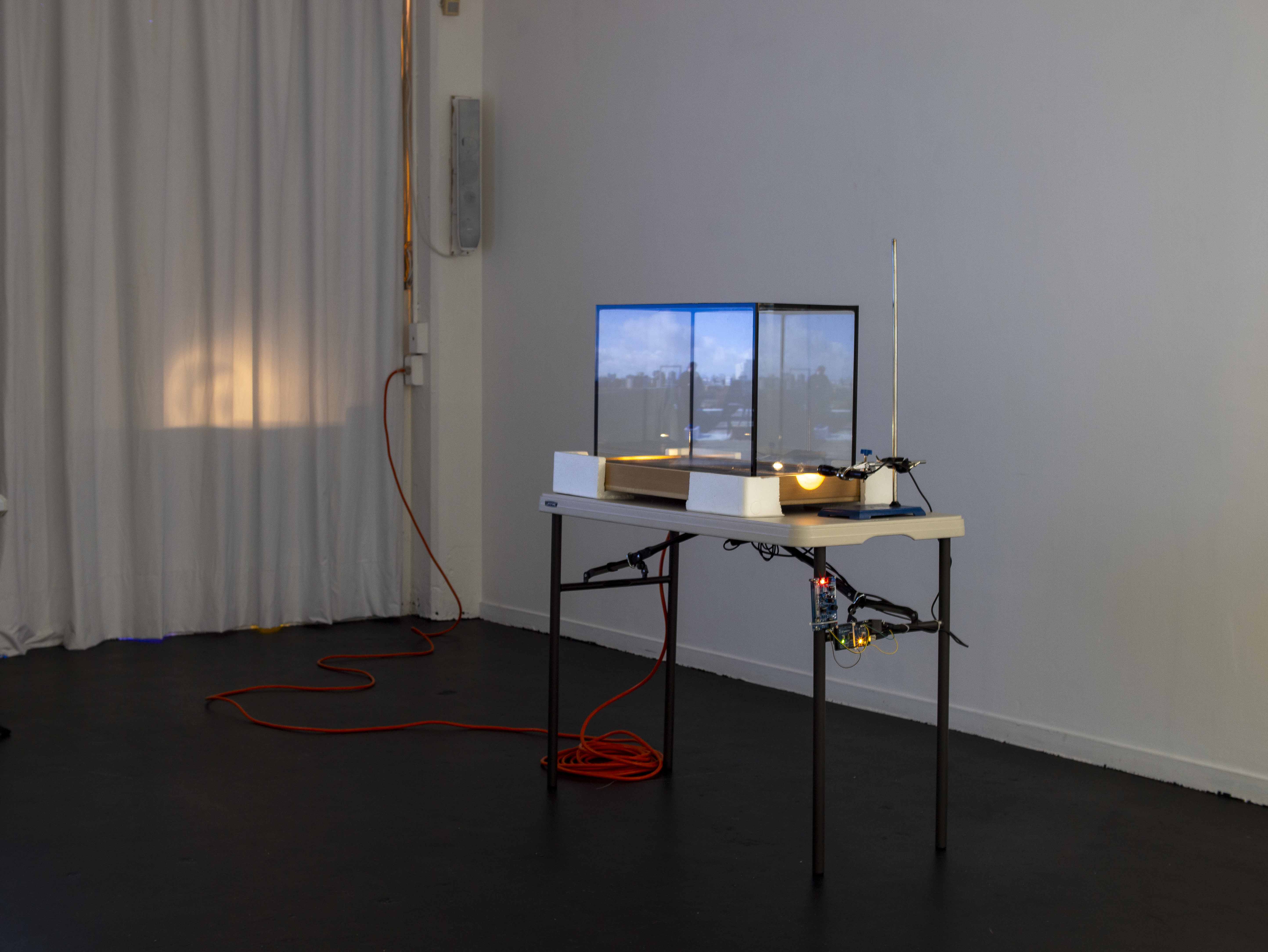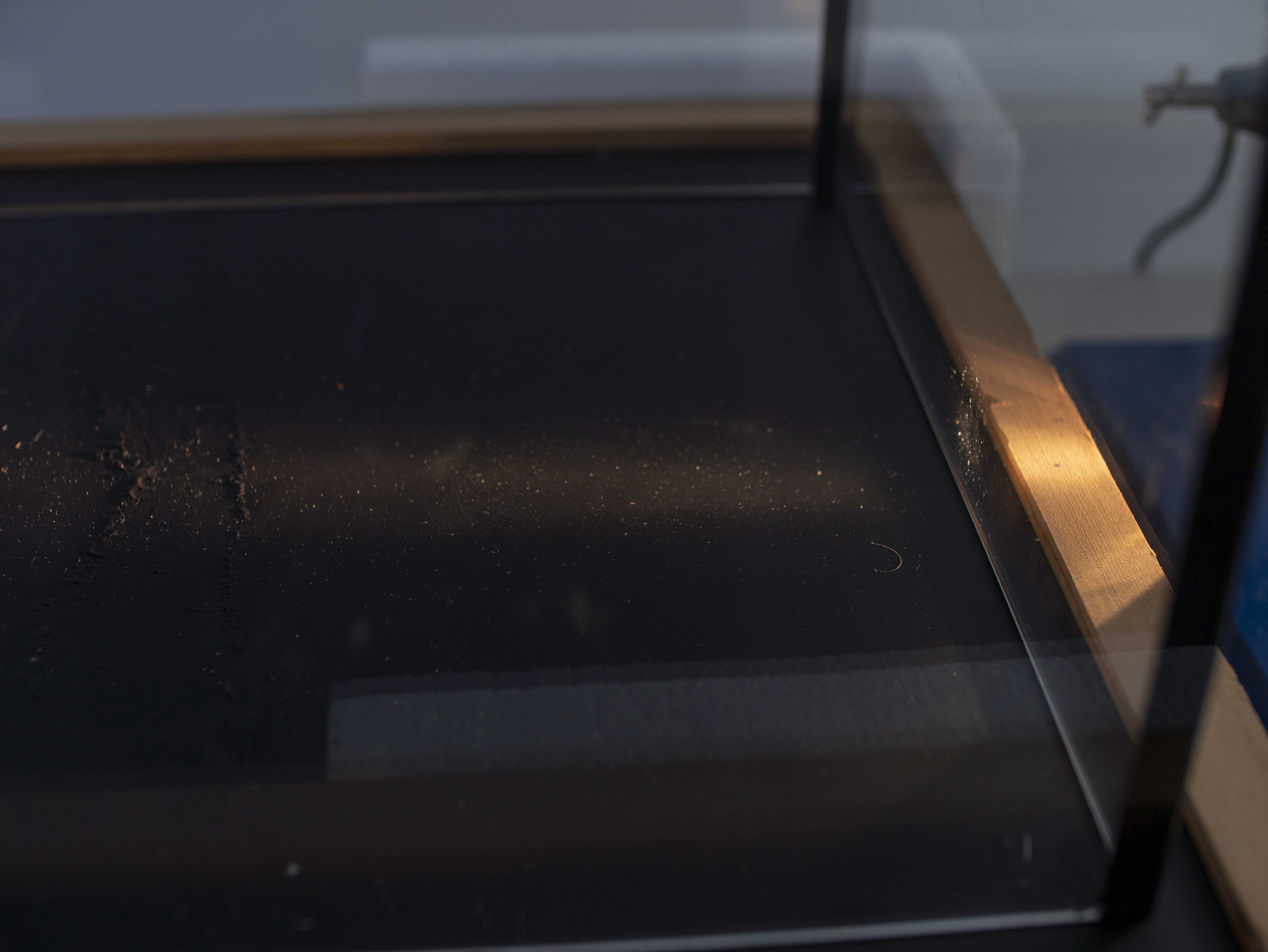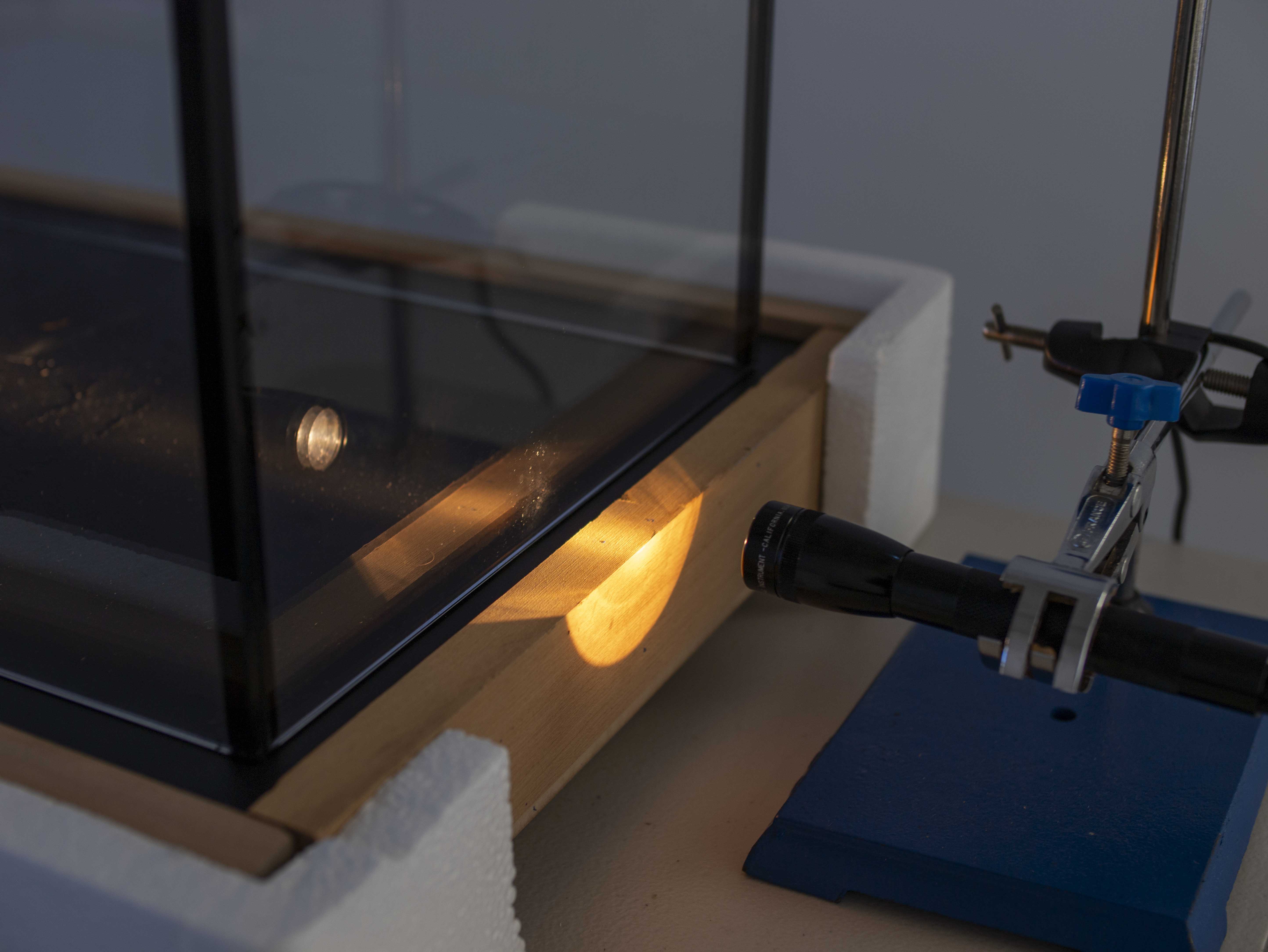 For Cloud Above, Cloud Below, The Observatory Project and Fernando Cremades have observed two clouds inside glass chambers at the antipodes of the Earth: drawing a line between Tāmaki Makaurau in Aotearoa and Madrid in Spain. In order to observe the trace of a radioactive particle moving through our immediate environment, we had our head in the clouds, under a blanket. Our eyes were each fixed on the local atmosphere inside a fish tank as the cloud started to form. Observations began, and we noted when we thought we saw something. The conditions had to be right: calm (no wind), gentle precipitation, and supersaturation. In a cloud of isopropyl alcohol, temporary trails reminiscent of those left in the sky by jets appeared as radioactive particles zipped through the chamber and our bodies. Identifying different shapes as they materialised in the vapour, we called out to each other cloud above, cloud below.