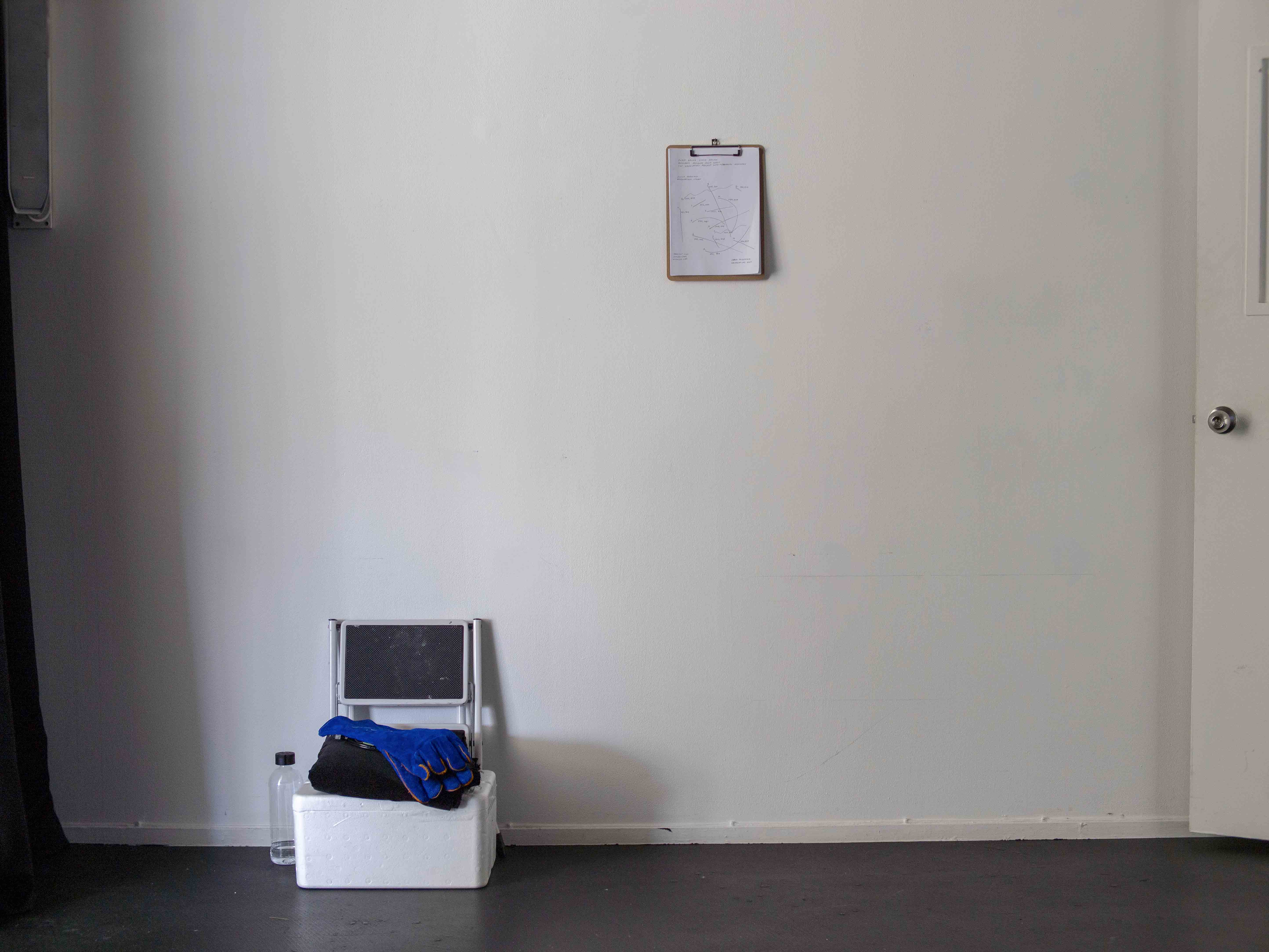 Fish tank, painted aluminium plate, gloves, dry ice container (polystyrene), velvet, felt, neodymium magnets, clipboard observations, orange power cable, folding table, step stool, custom button, Arduino mega 2560, Geiger-Müller counter, modified Maglite mini torch, relay (solid state), code, retort stand, jump wires, zip ties.