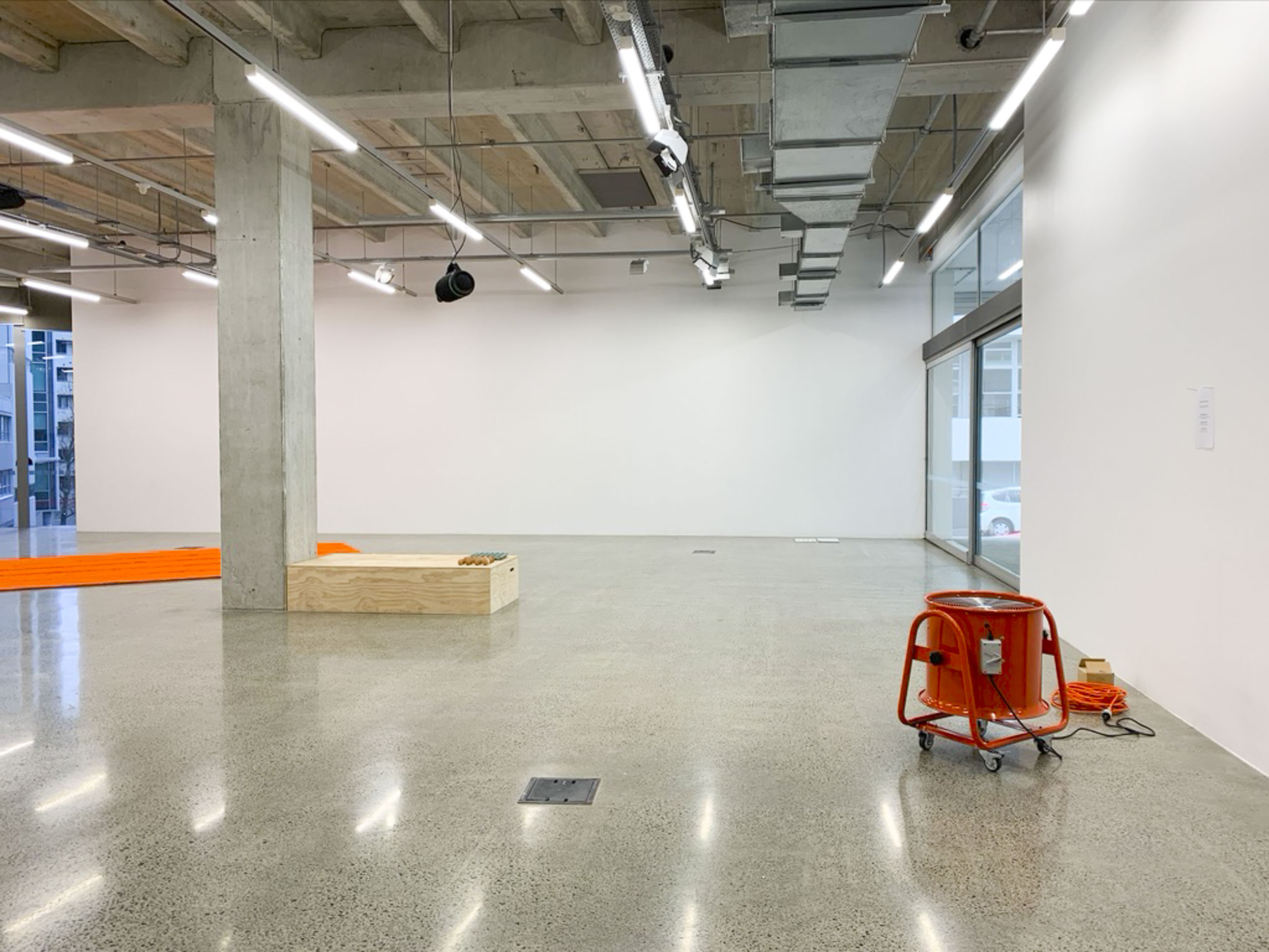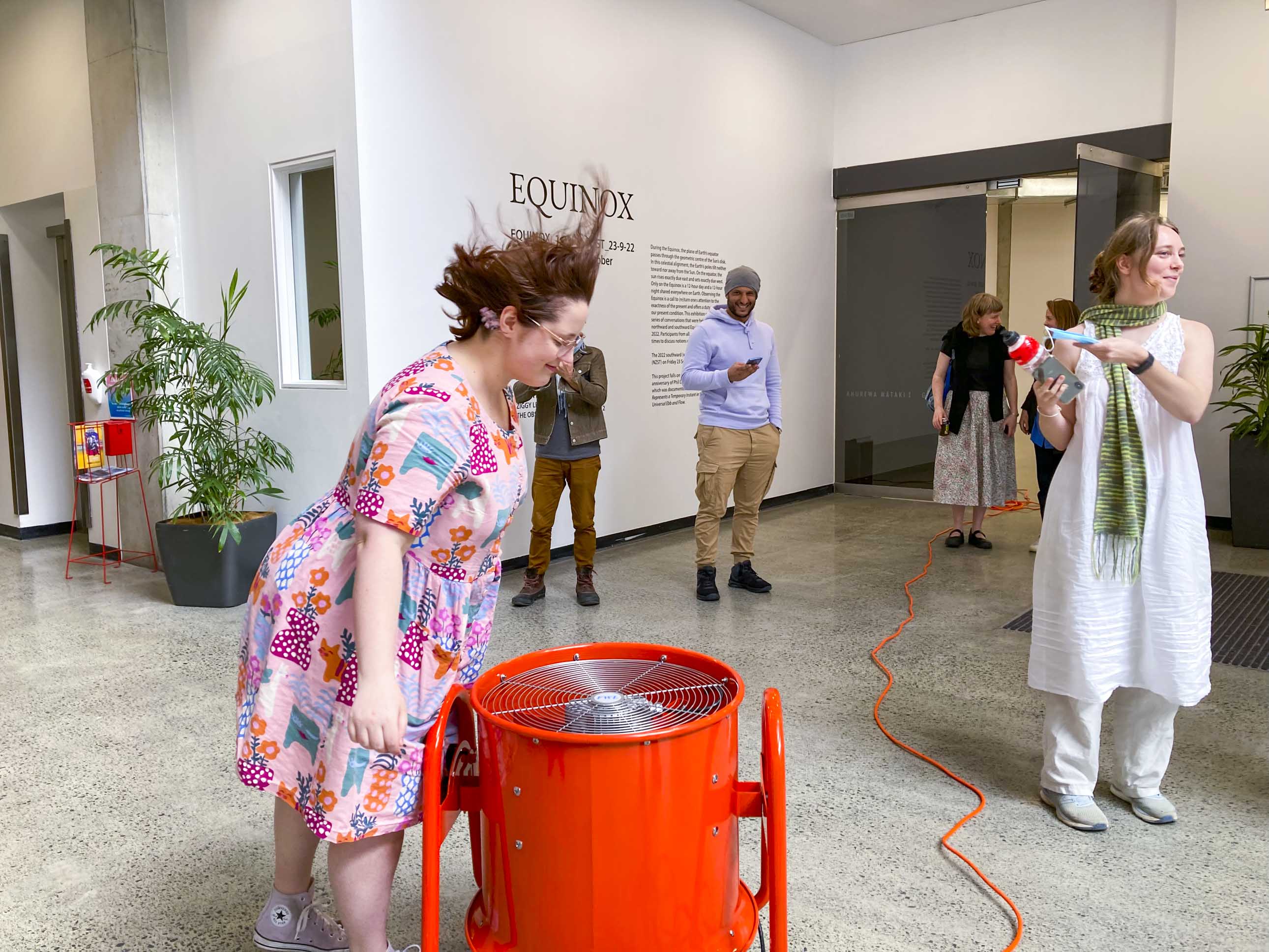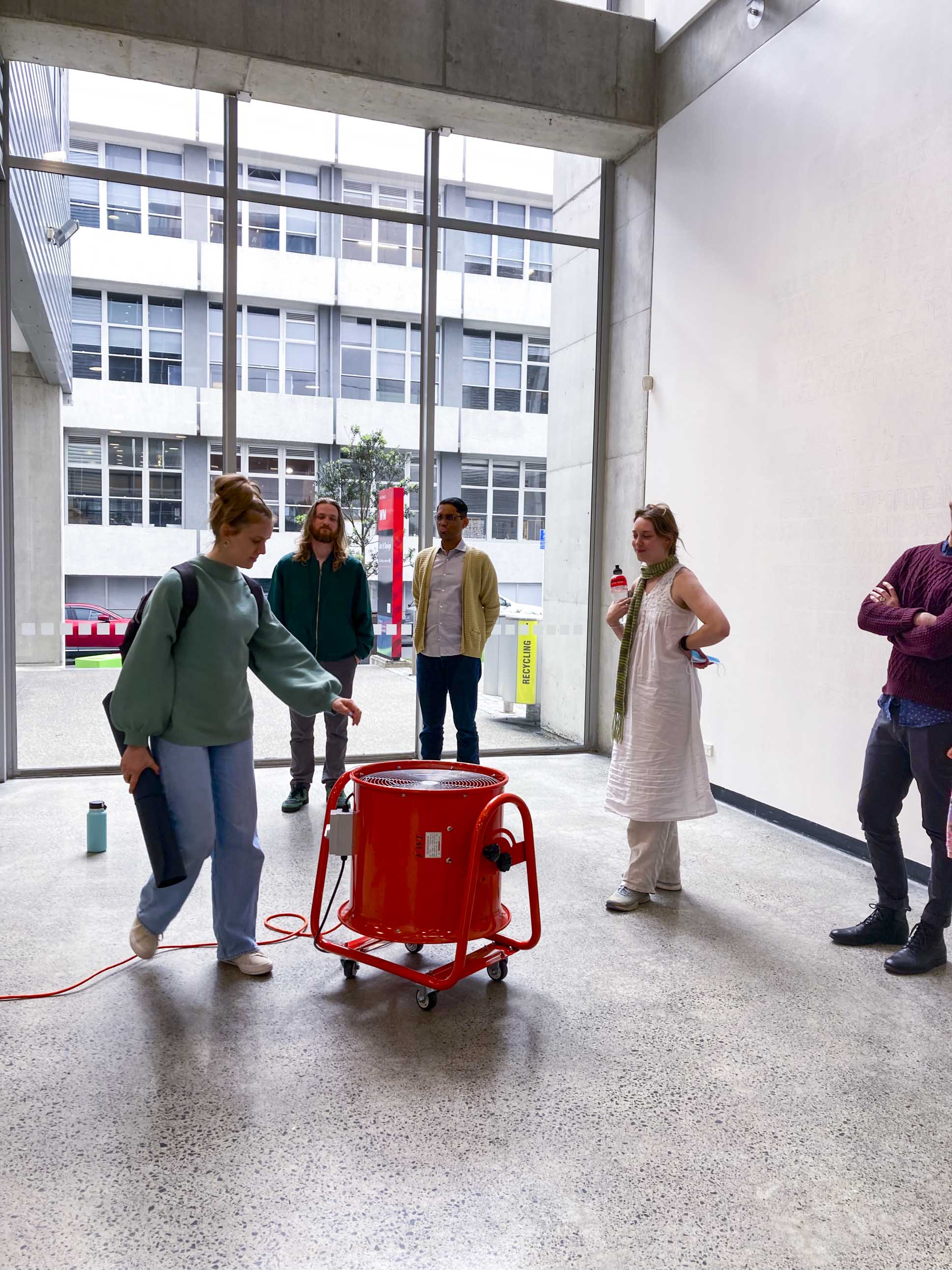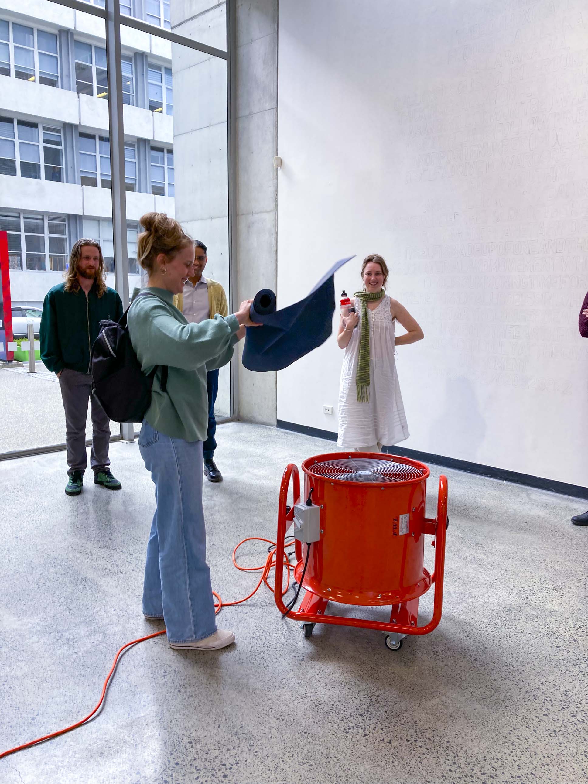 Rounds After Accelerated Air, 2022, three atrium activations, orange fan, orange extension cord, A4 paper, packing peanuts.