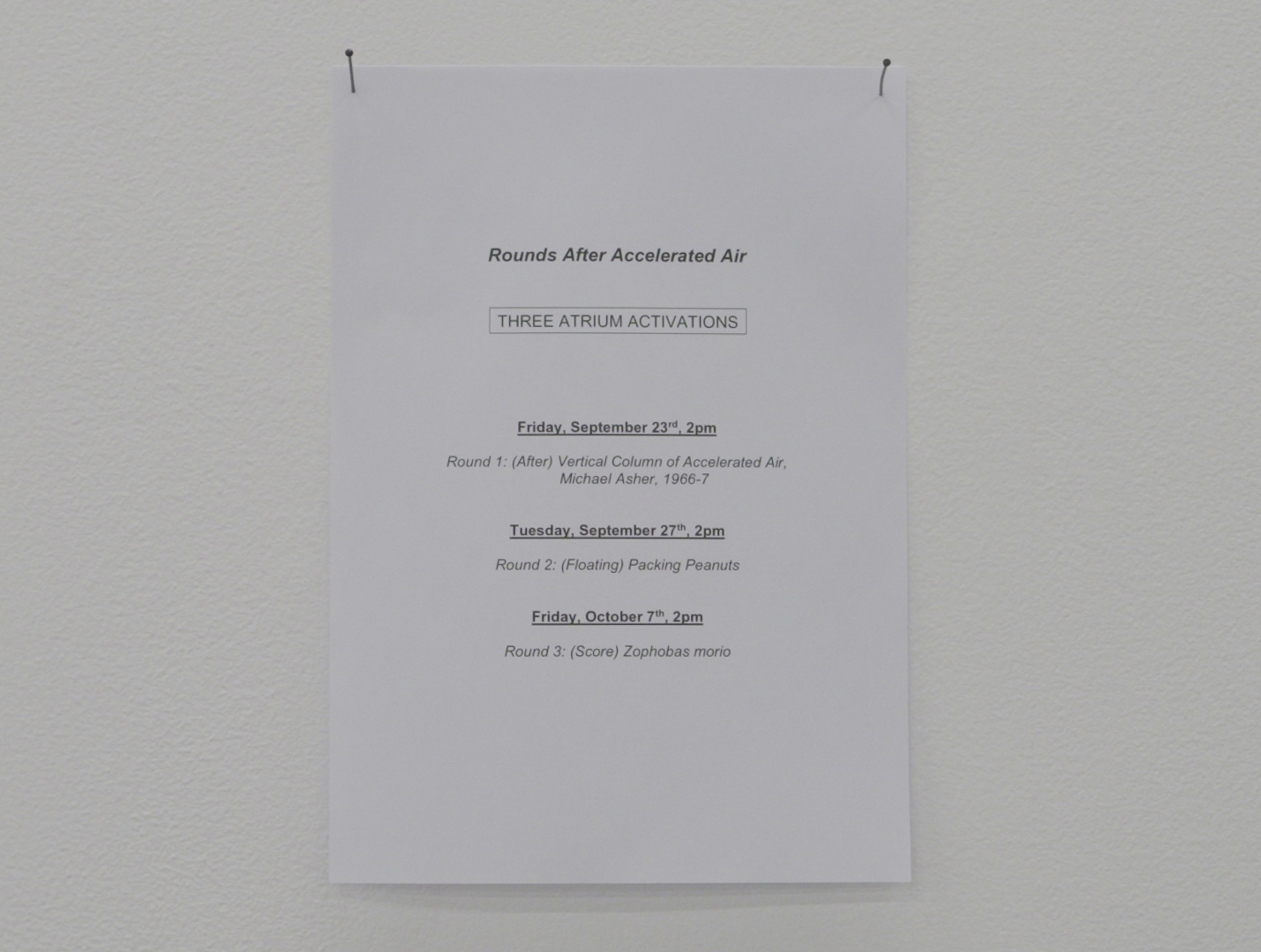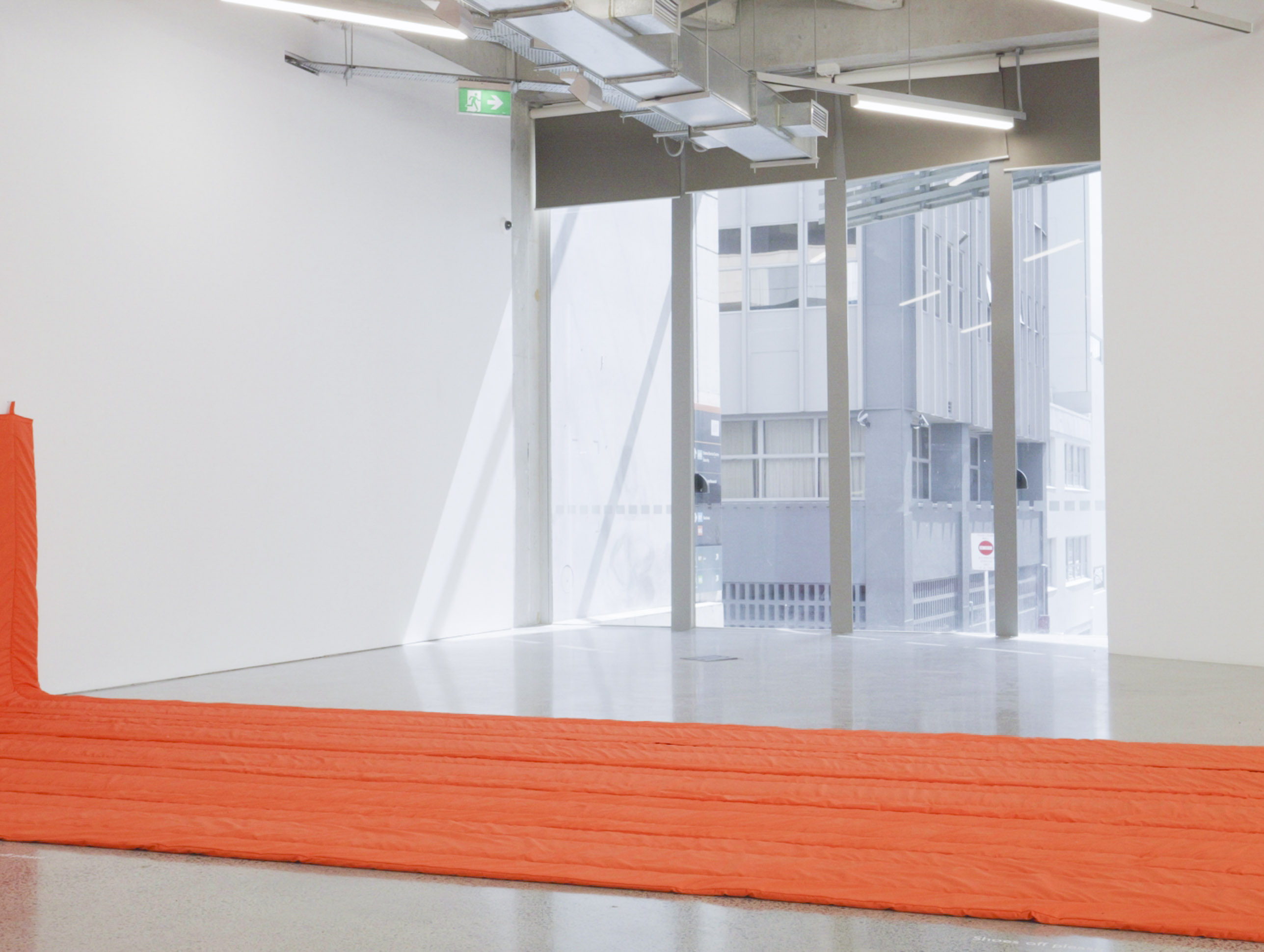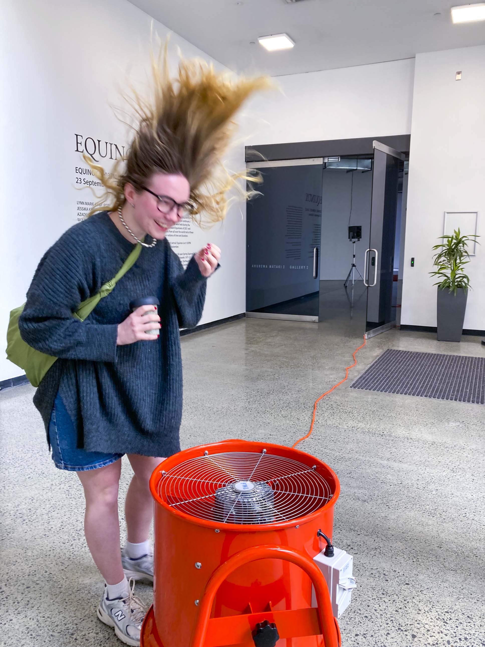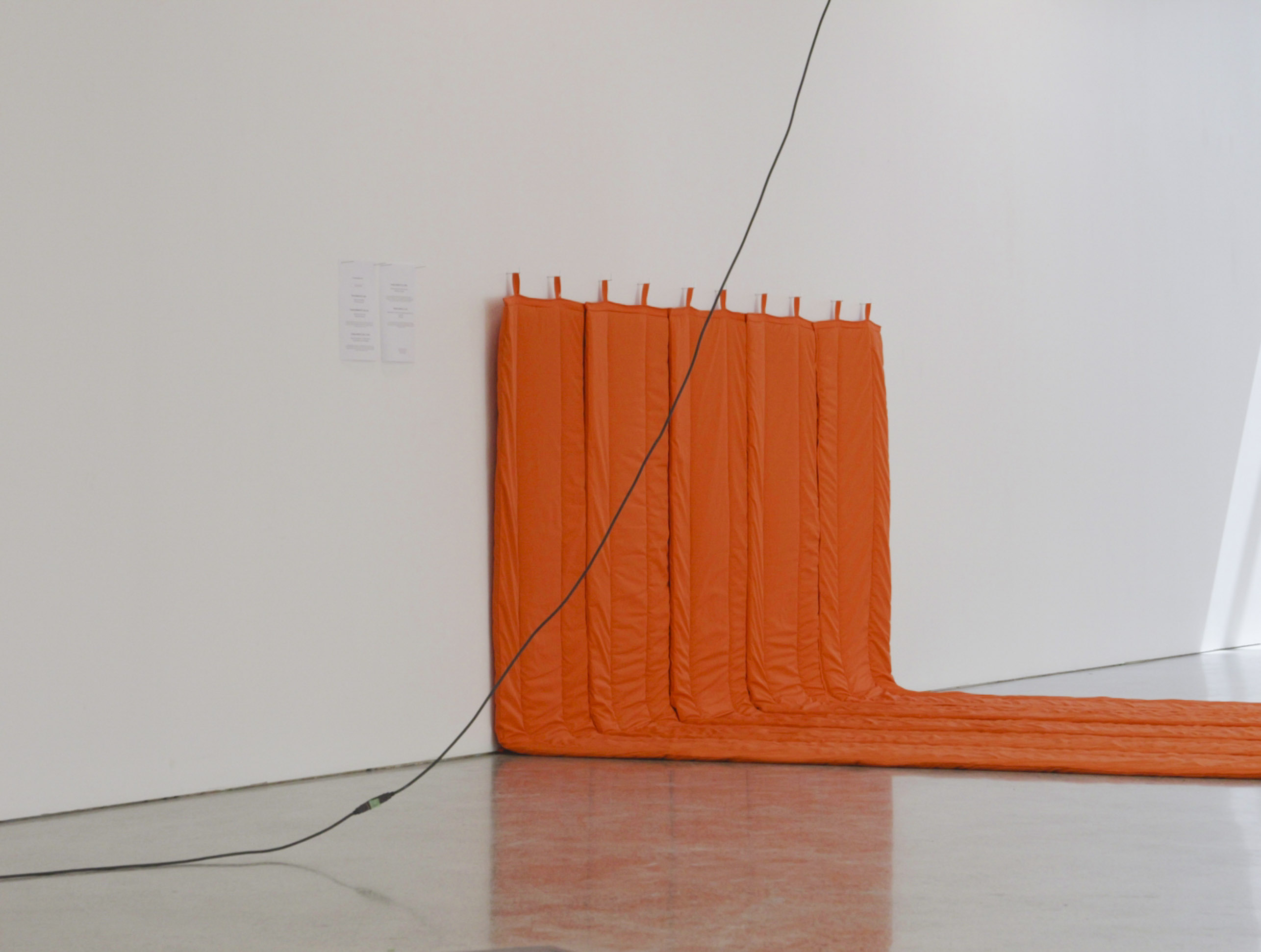 Rounds After Accelerated Air, 2022, three atrium activations, orange fan, orange extension cord, A4 paper, packing peanuts.