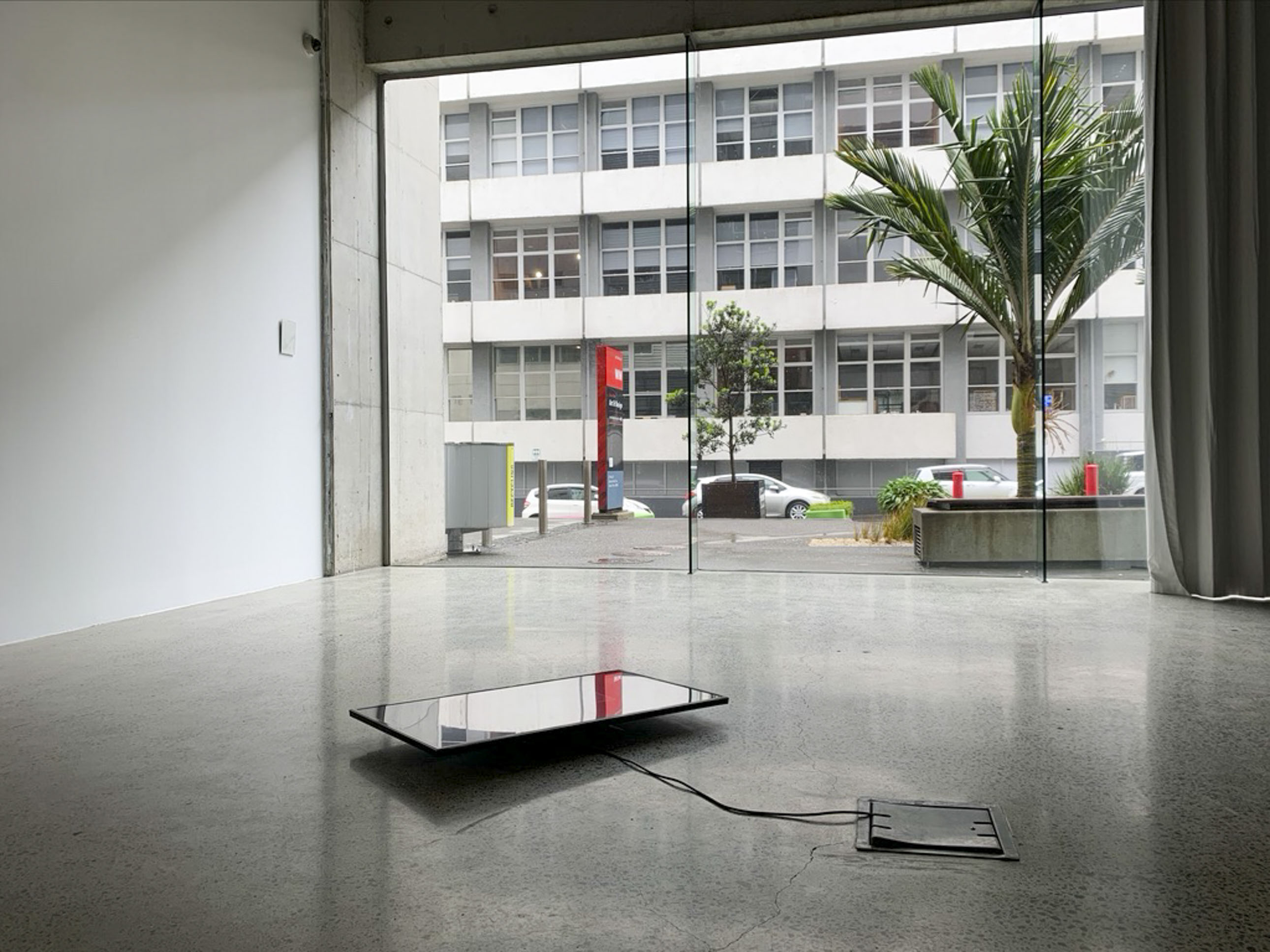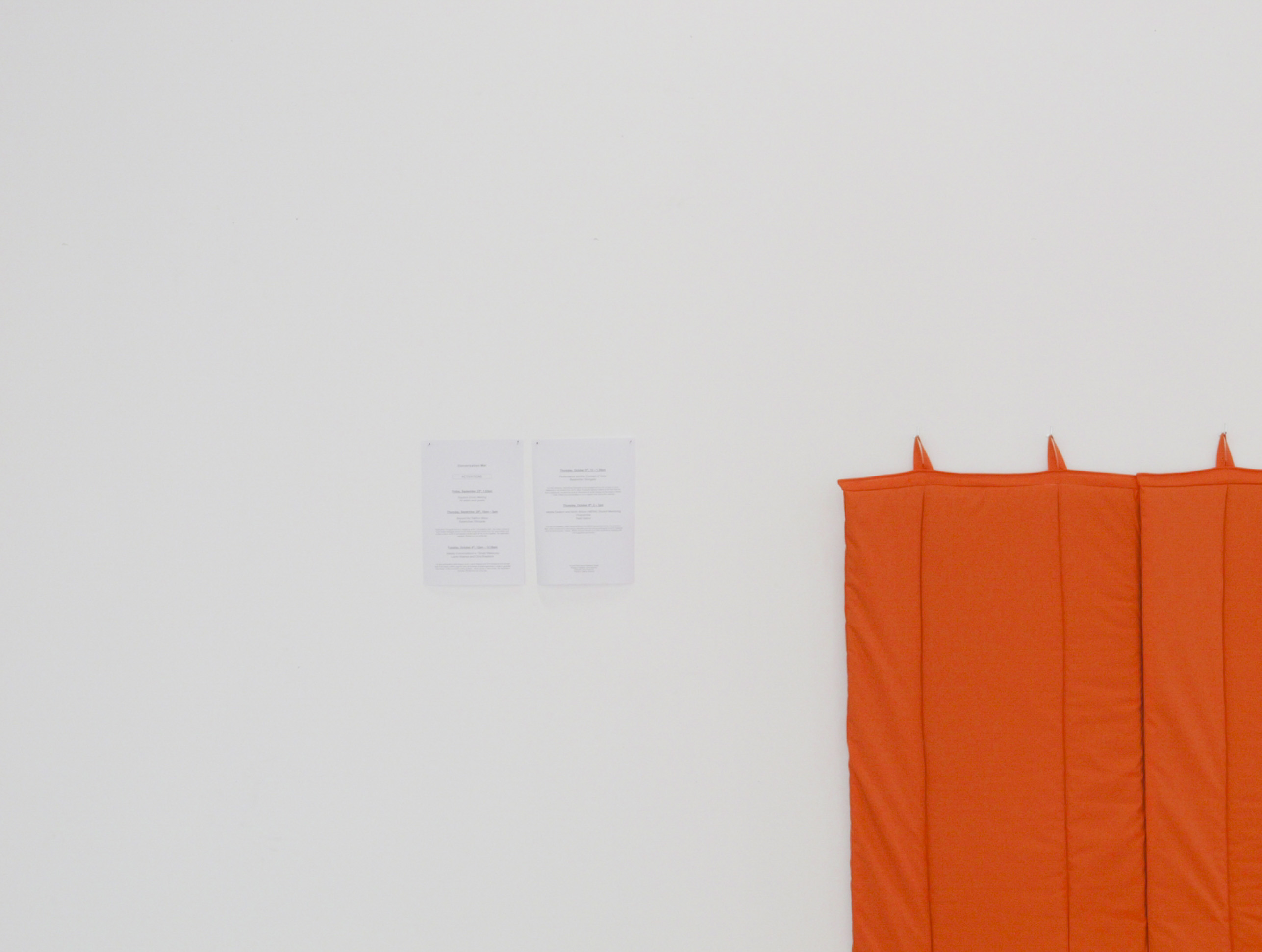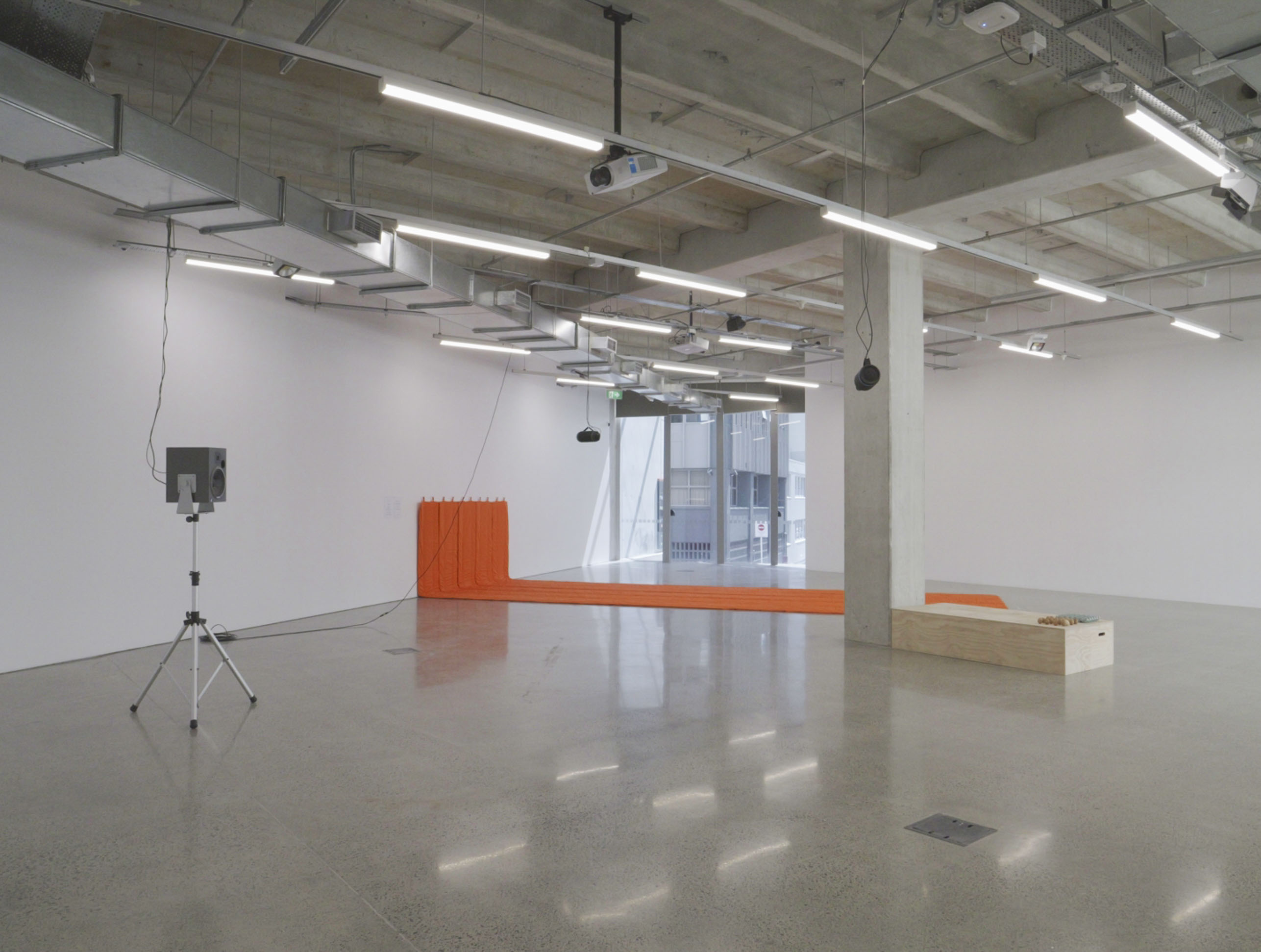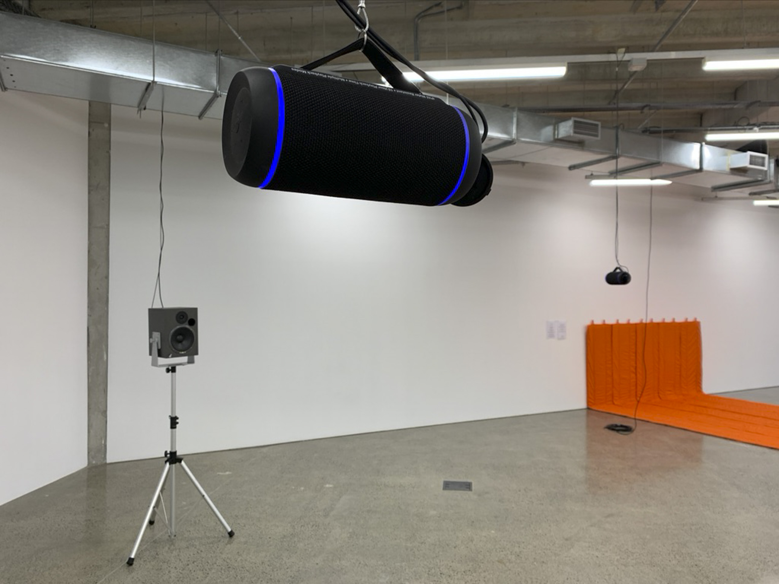 Rounds After Accelerated Air, 2022, three atrium activations, orange fan, orange extension cord, A4 paper, packing peanuts.