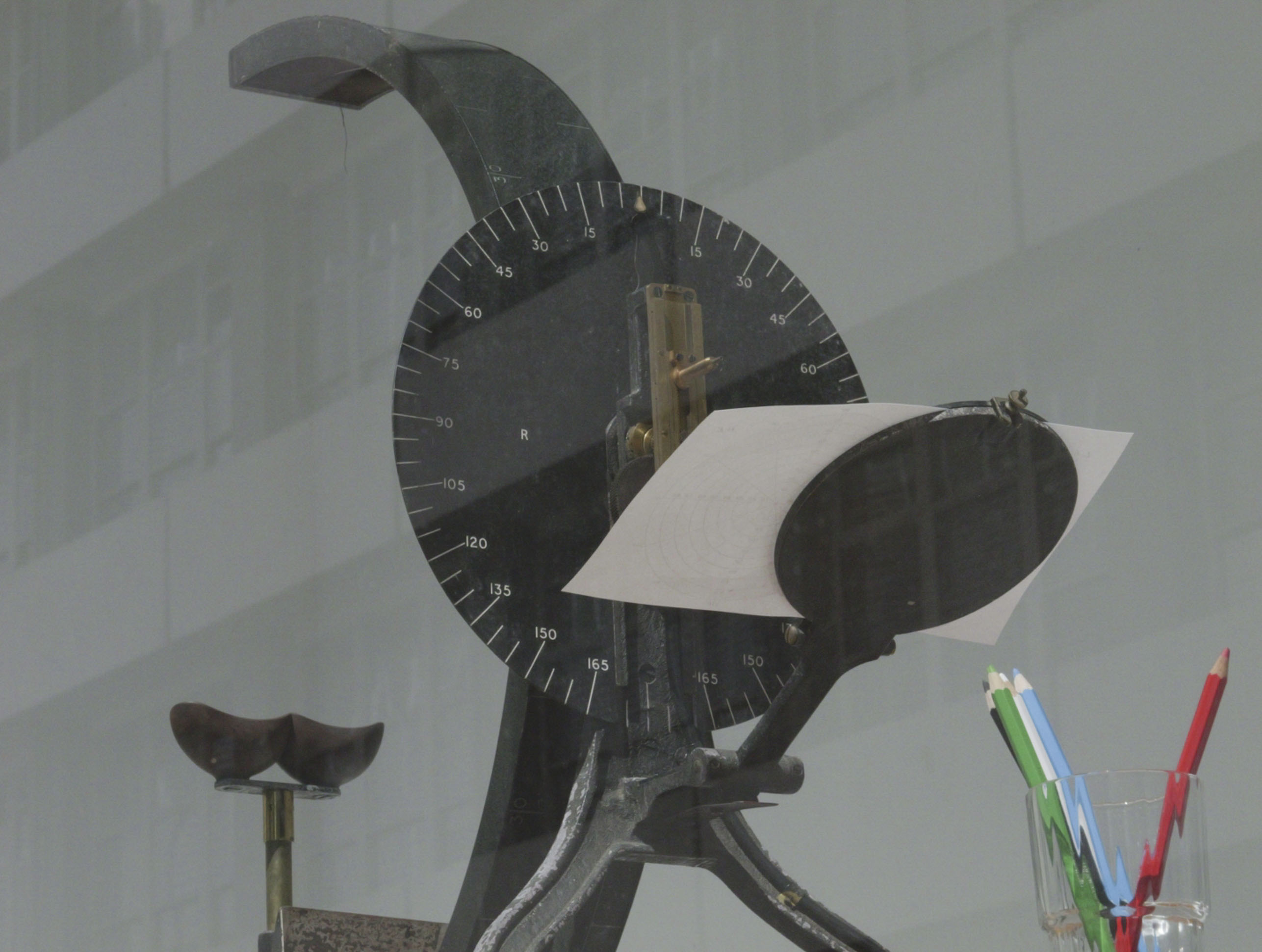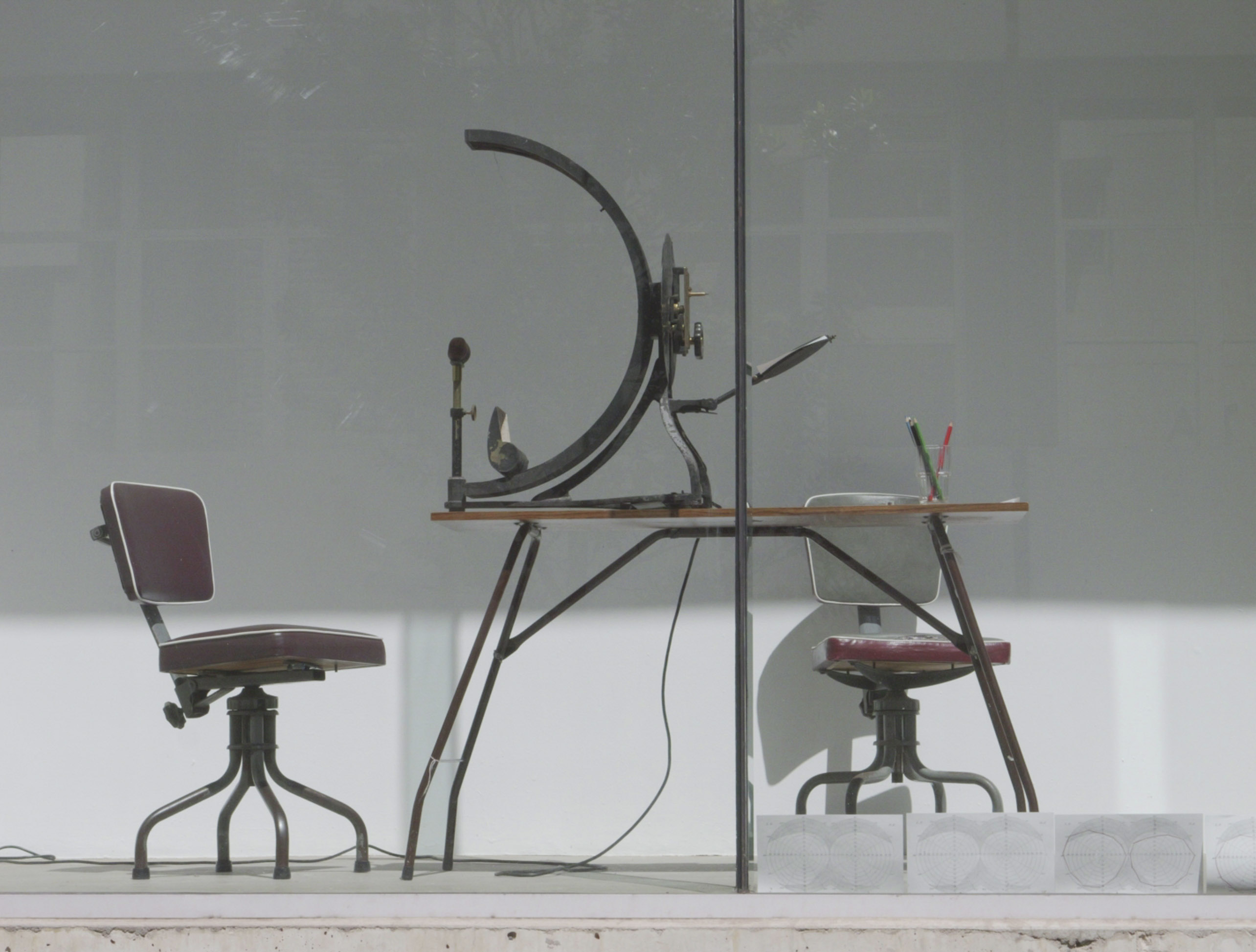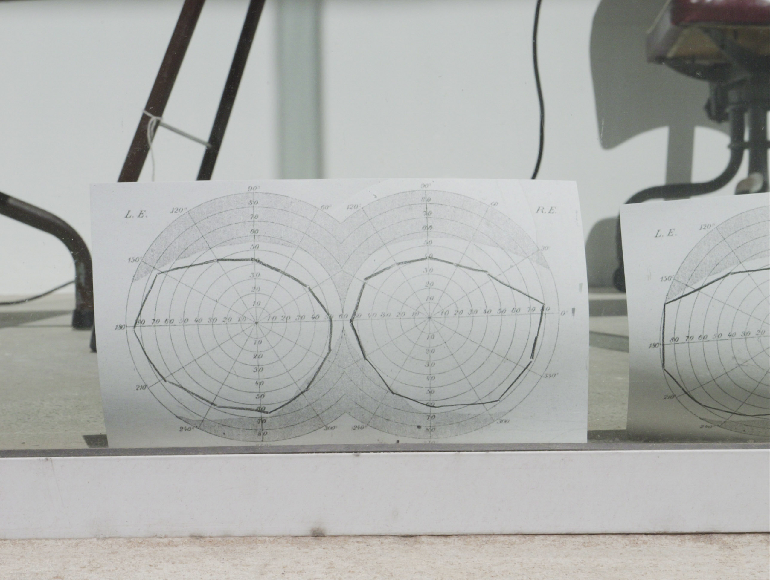 A Measurement of Both Eyes Together (AMBIT), 2022, perimetry experiments, lister perimeter, table, chairs, coloured pencils, risograph charts.