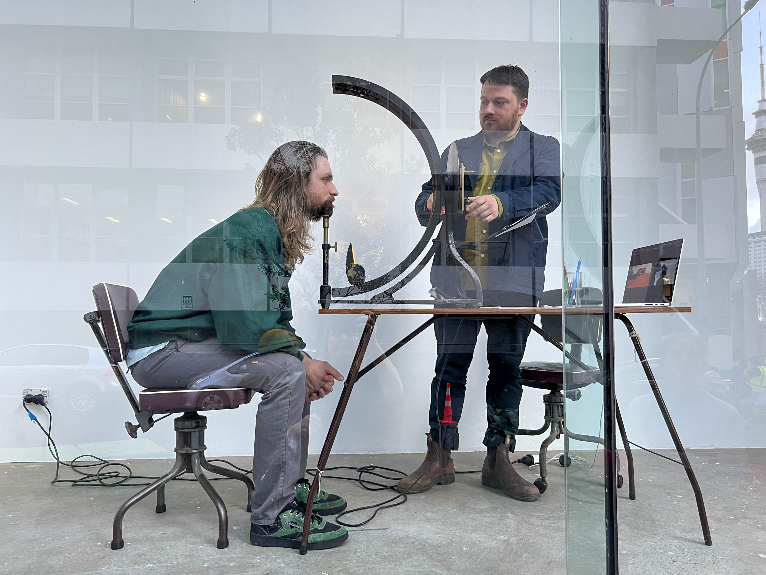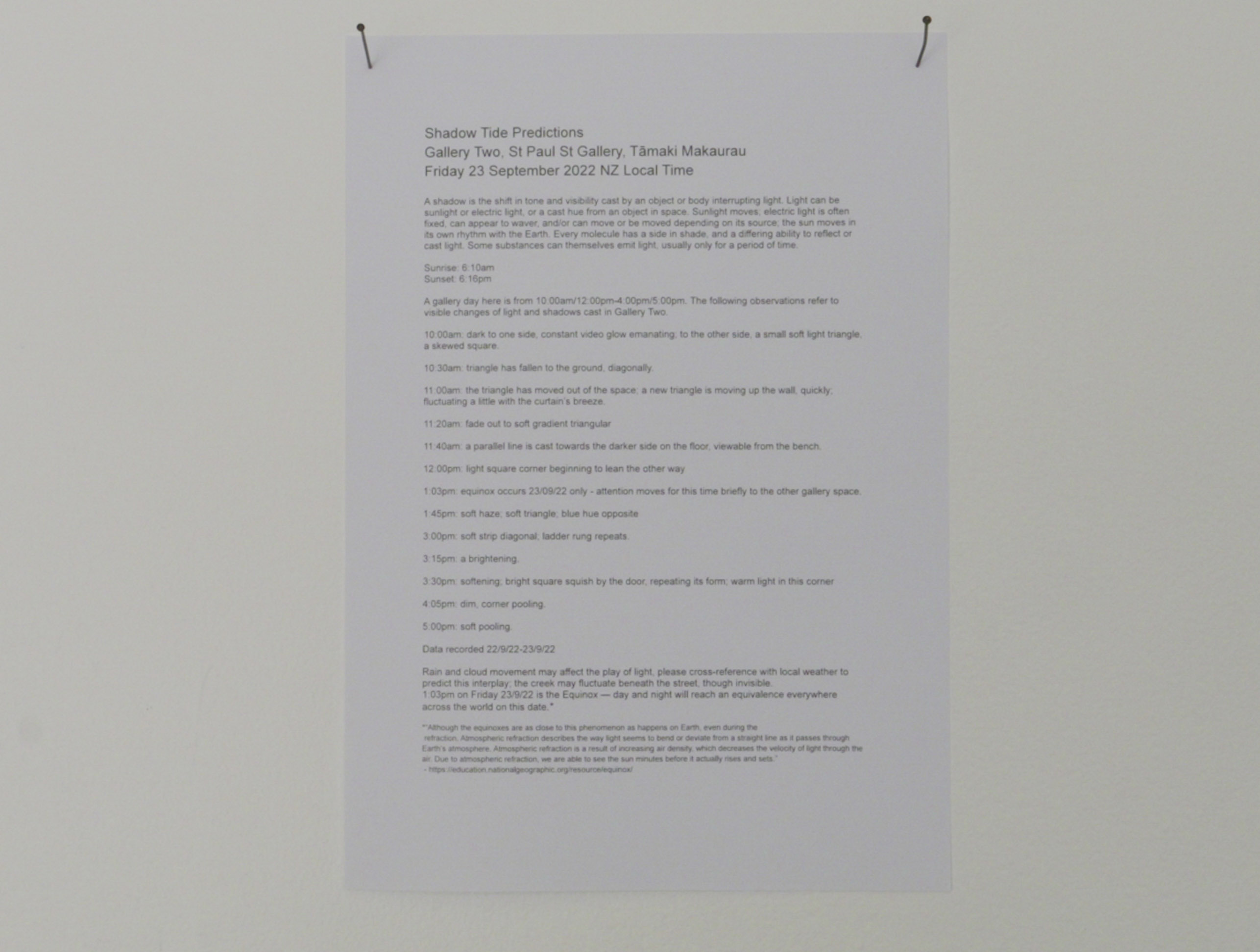 For Time Announcements, participants in the Equinox project recorded themselves announcing the time in the days surrounding the vernal equinox in September 2022. These announcements were then broadcast intermittently over speakers hidden in the cieling throughout the duration of the exhibition.