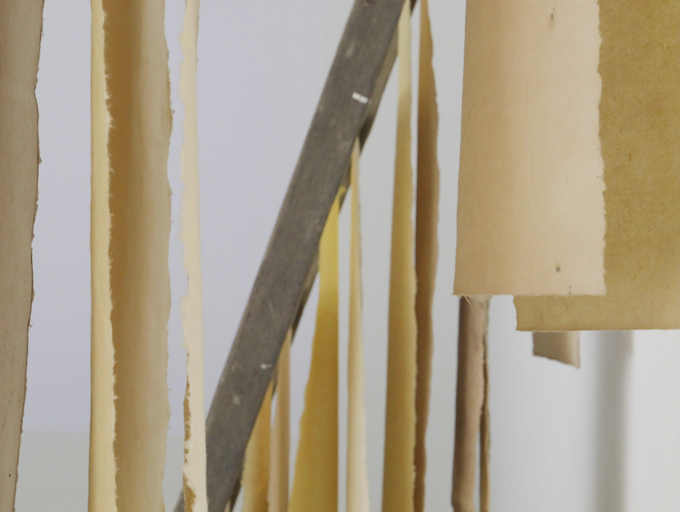 Equinox 22, 2022, mulberry paper, dyes made from petal, leaf and root of the Verbascum thalpus (Great Mullein) plant, pins, wooden ladders.