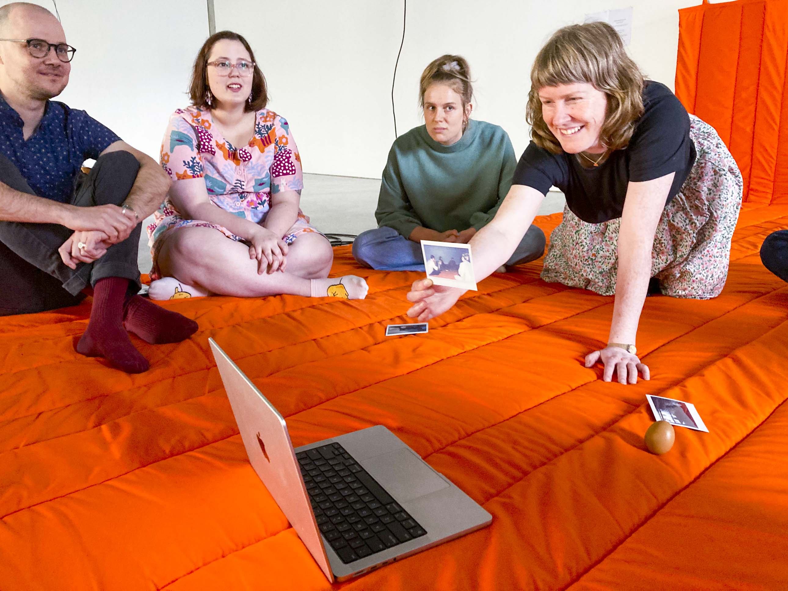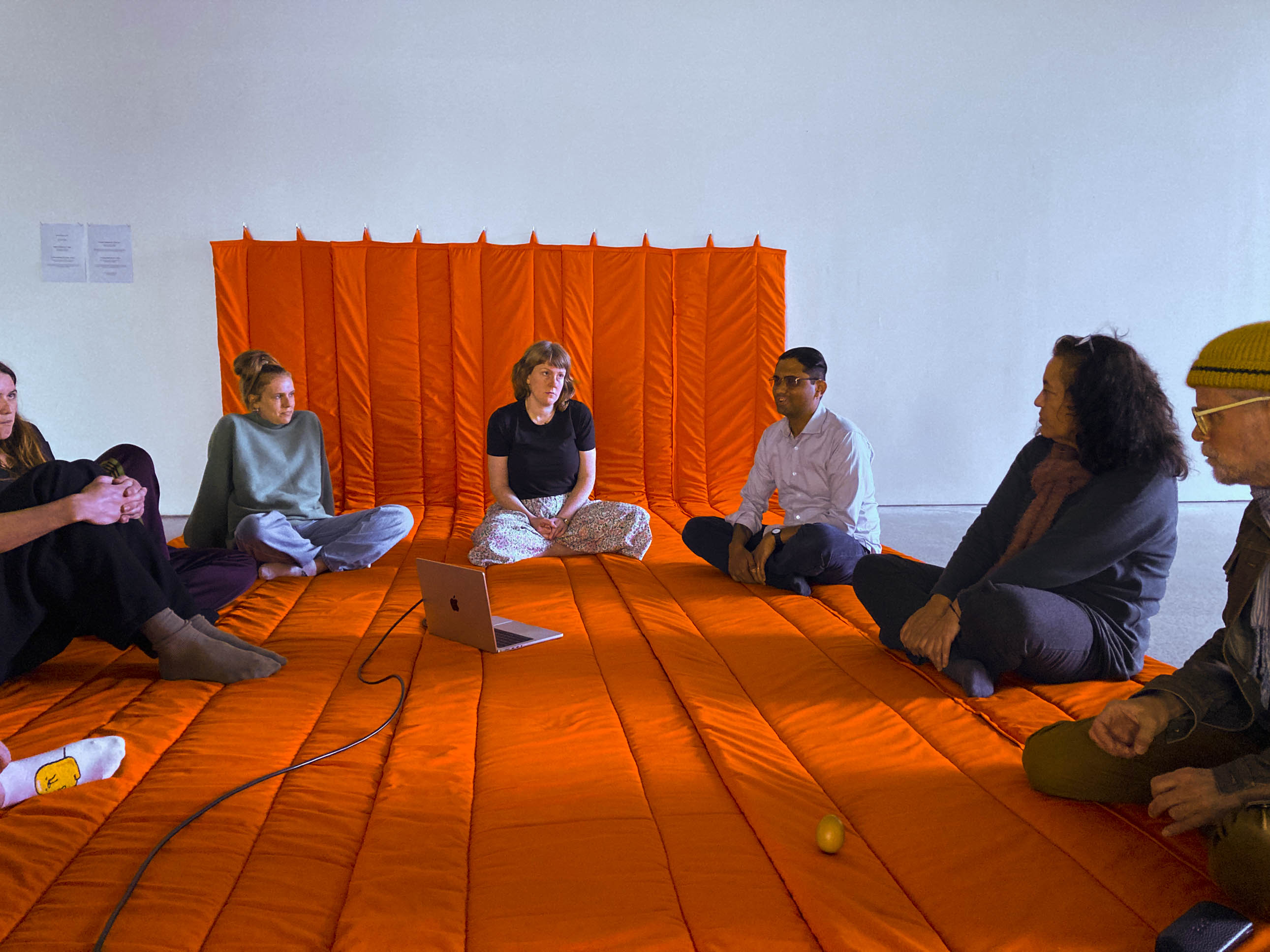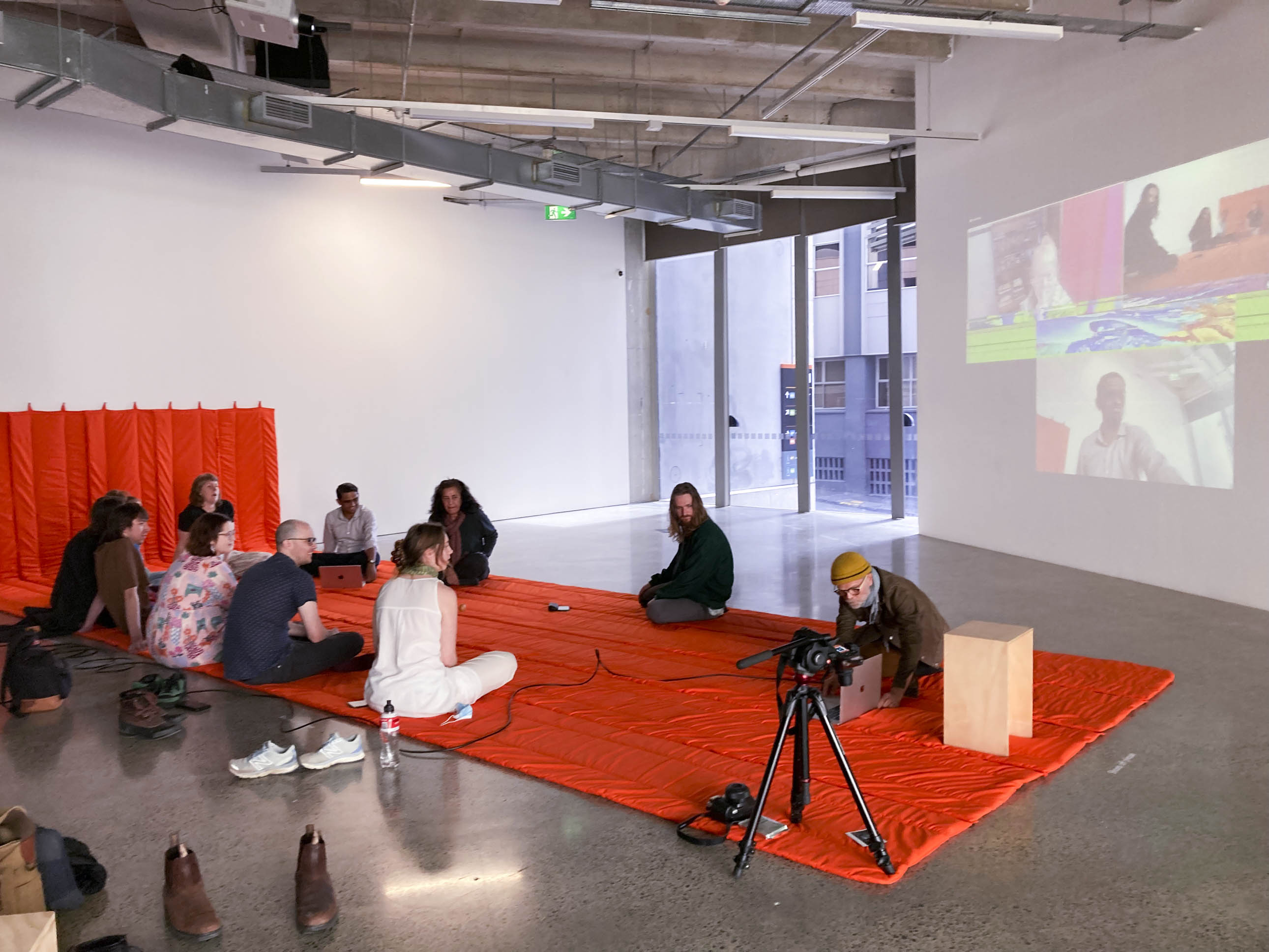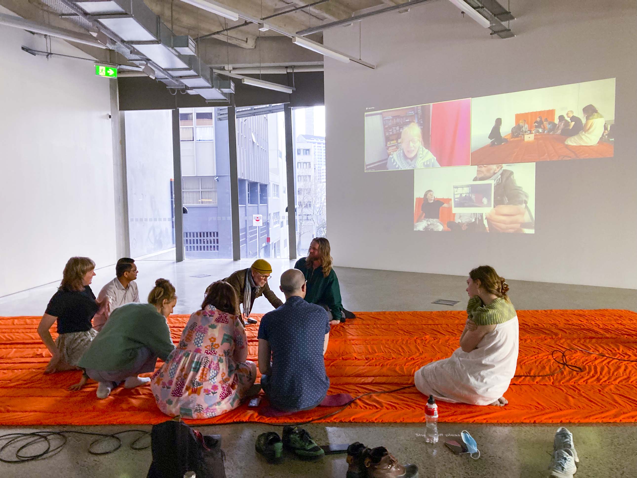 The final Equinox zoom meeting for the project. This took place on Friday 23 September at 1.03PM (NZST) marking the 2022 southward (vernal) Equinox. Participants met in Tāmaki Makaurau/Auckland and assembled on the large orange quilt/mat titled "Conversation Mat" in ST Paul St Gallery. Those overseas joined on zoom, marking the opening of the exhibition.