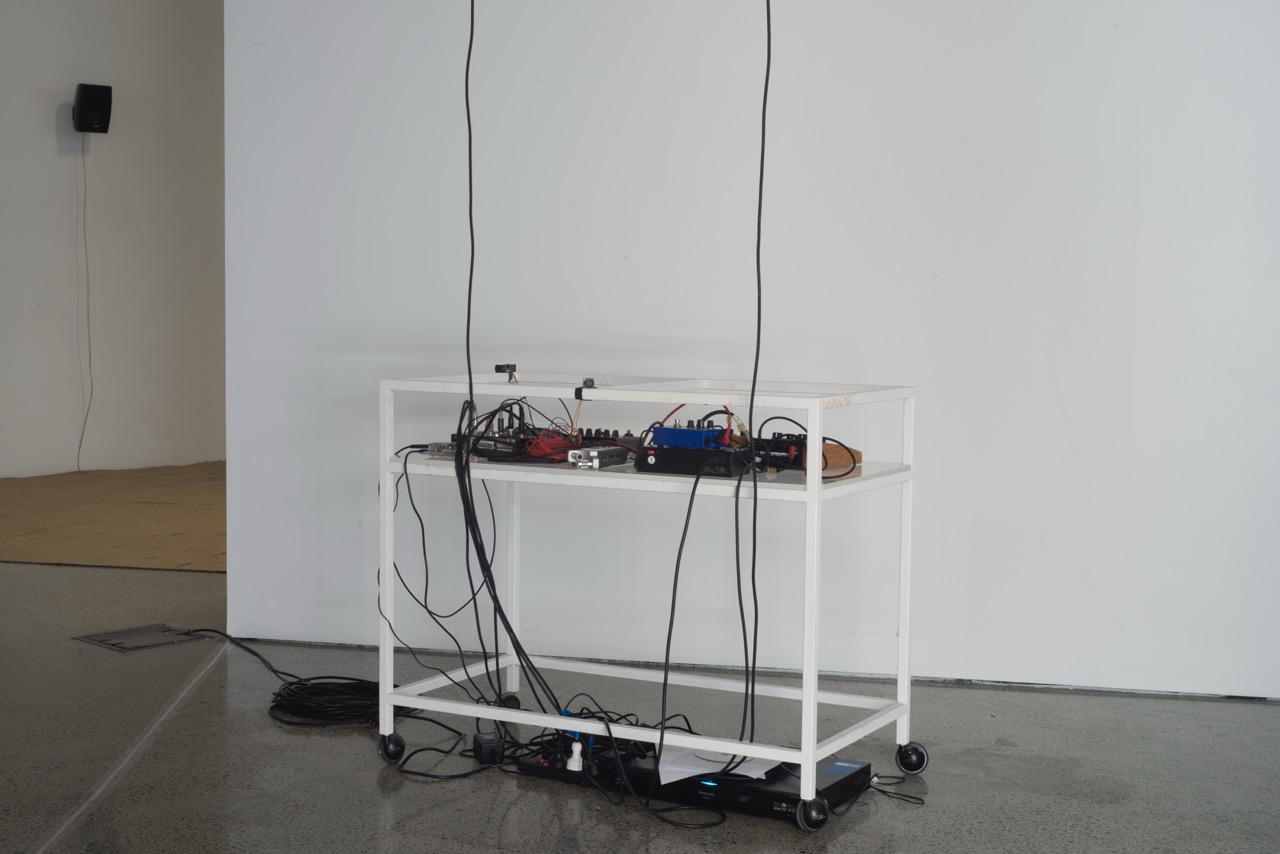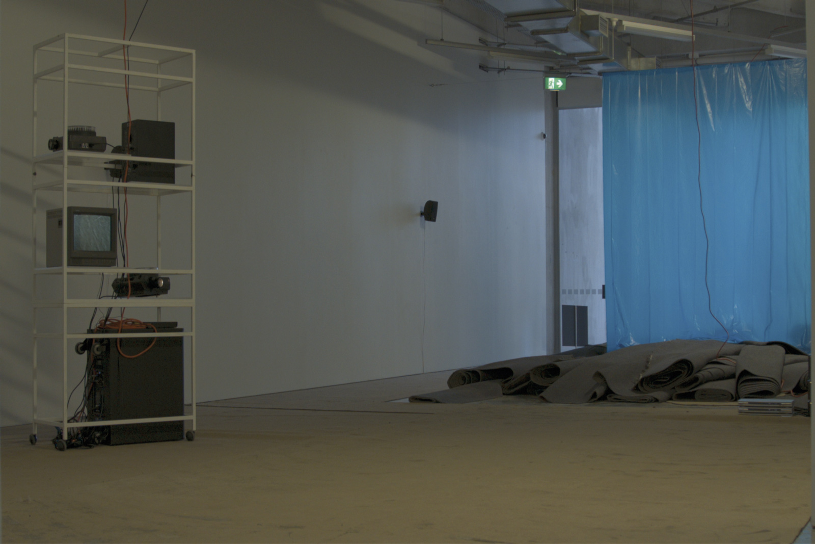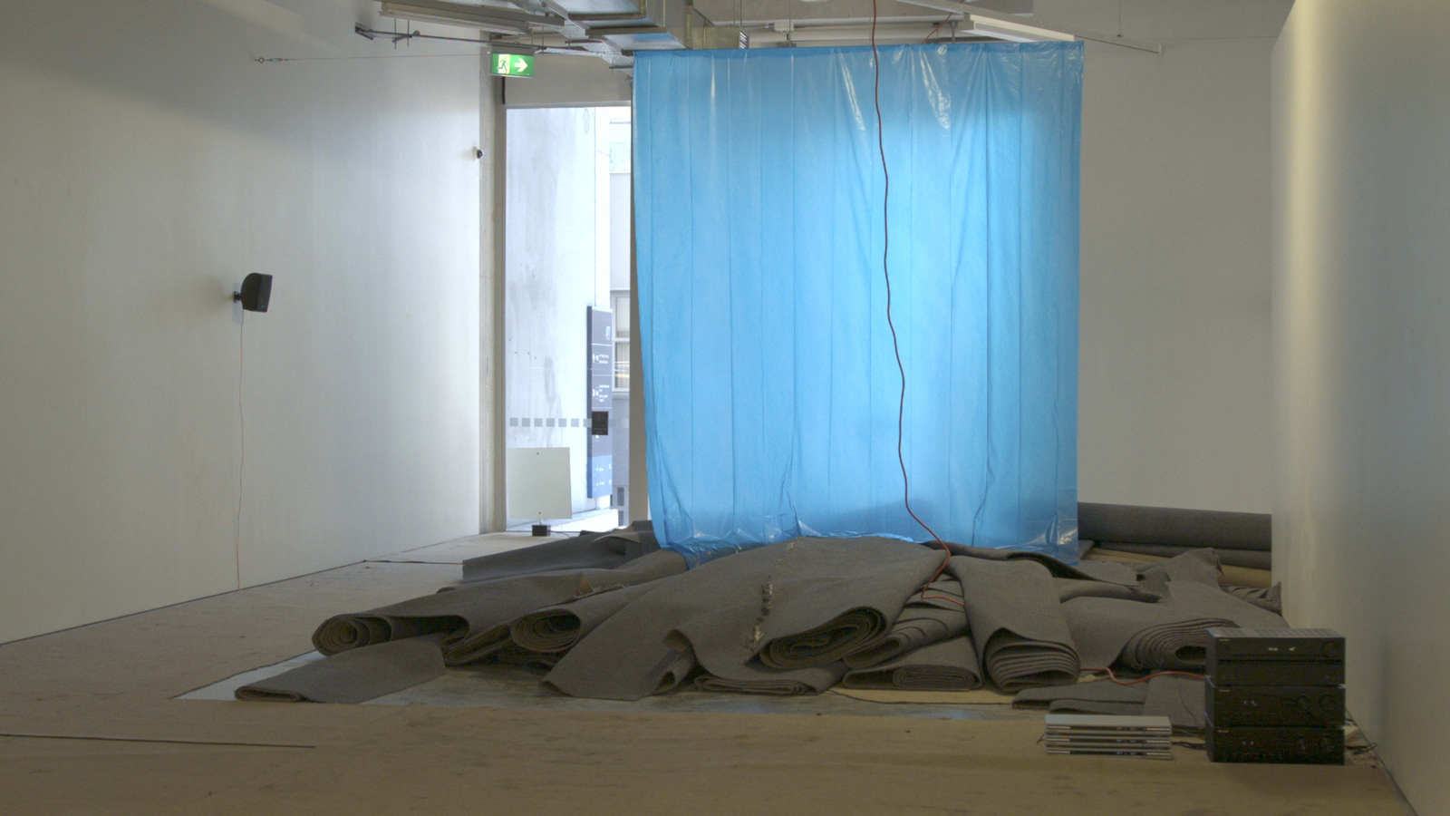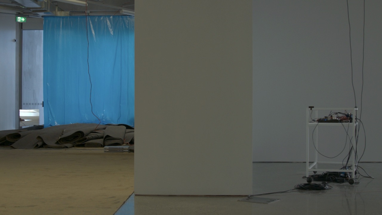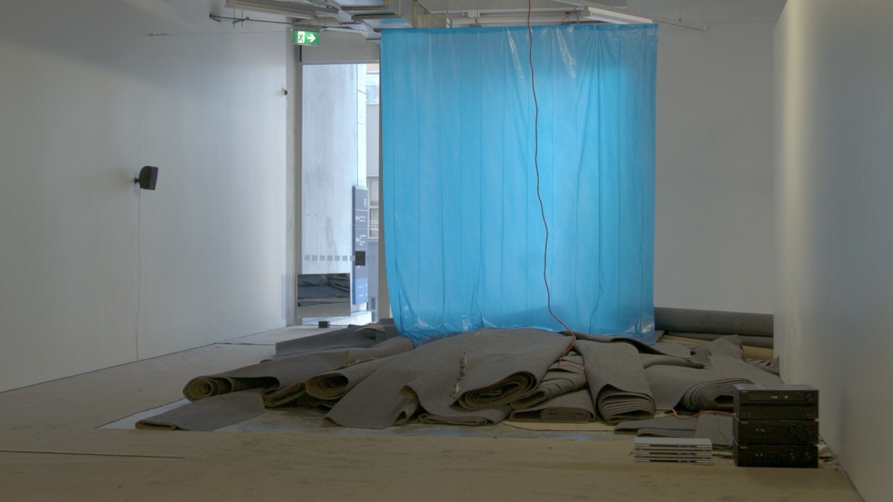 Plastic drop cloth (blue), 12" speakers, Sony Trinitron CRT monitor with the work Song (Fantasia) of (on Byrd's) Humpback Whale (Miserere Mihi), for Paine, Turnbull, W. Banks, 2016, 8mm B/W film, sound (20 mins loop), DVD player, slide projectors, B/W negative slide sequence, mounted speakers, speaker wire, perspex, sub-woofer, extension cords (black), extension cords (orange), audio cables, carpet (800m2) installed folded/unfolded/upside-down and un-fixed, three-screen video with the work A Round for Rocks and Stones, 2014, appropriated painting trolleys, gravitational wave data, various filters, oscillators, and audio modulation devices, raspberry pii with custom coding, infra-red sensor, optical sensor, paper, sound archive generated during the installation (with Eamon Edmundson-Wells).