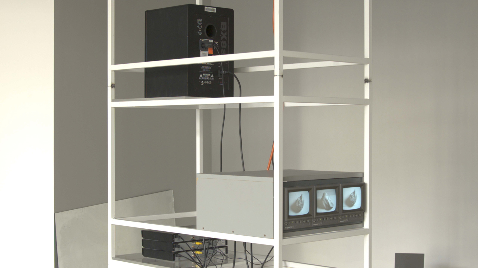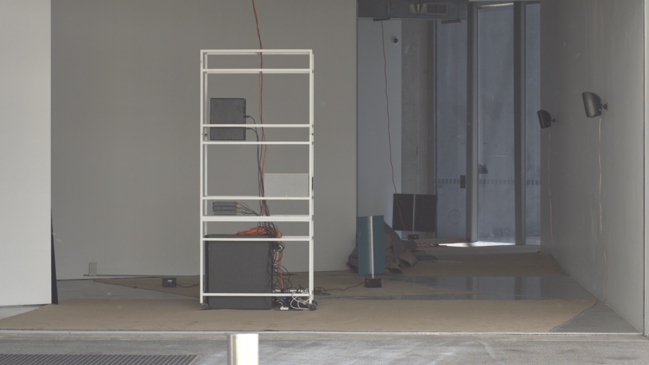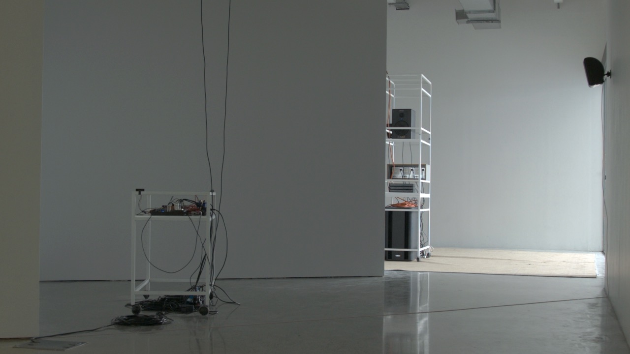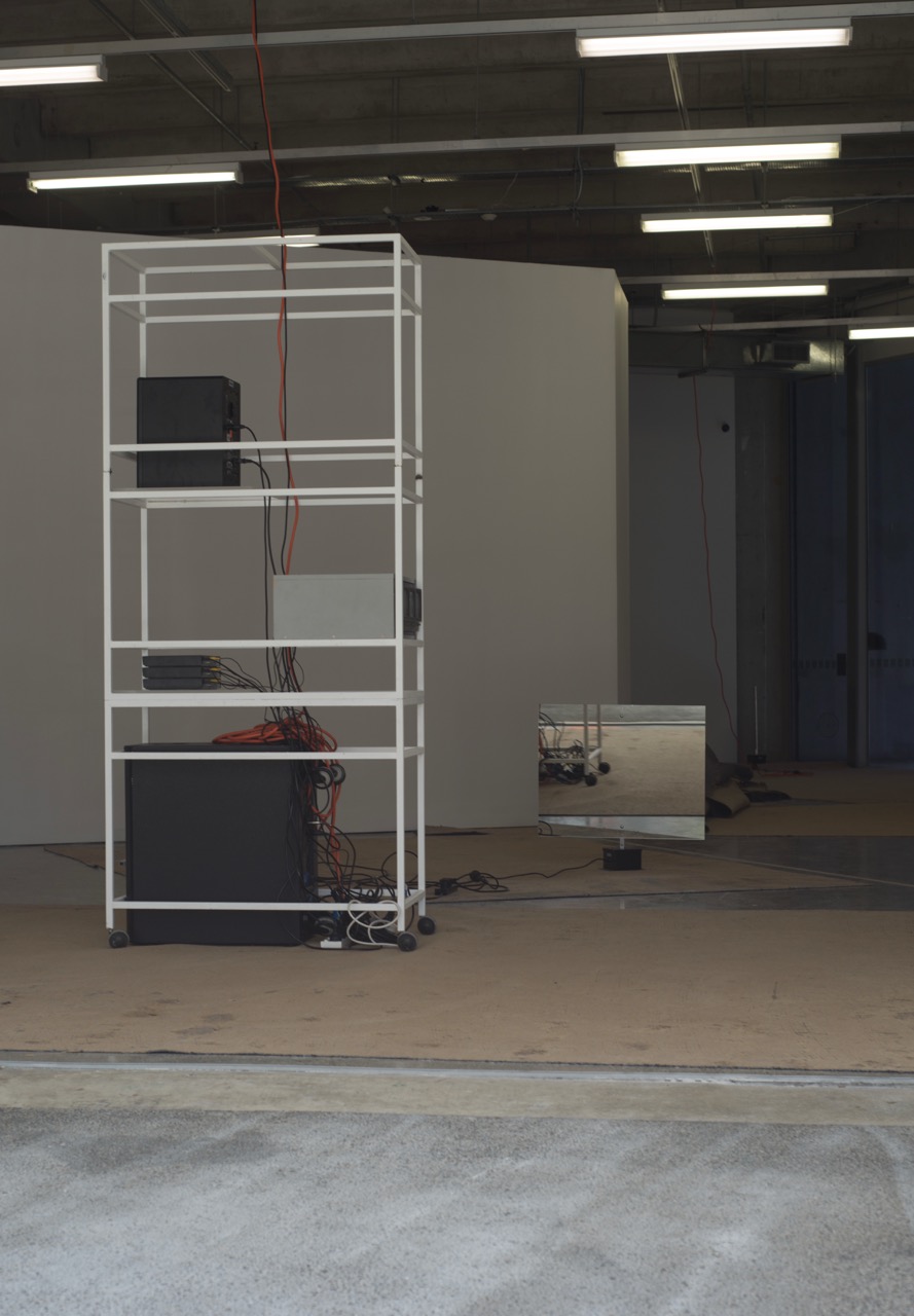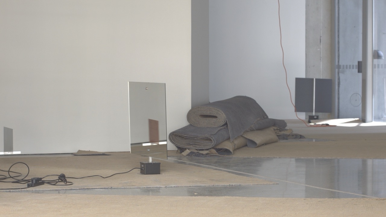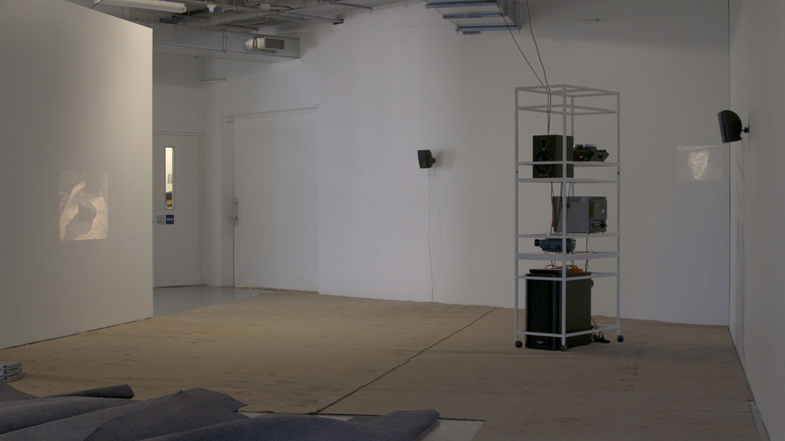 Plastic drop cloth (blue), 12" speakers, Sony Trinitron CRT monitor with the work Song (Fantasia) of (on Byrd's) Humpback Whale (Miserere Mihi), for Paine, Turnbull, W. Banks, 2016, 8mm B/W film, sound (20 mins loop), DVD player, slide projectors, B/W negative slide sequence, mounted speakers, speaker wire, perspex, sub-woofer, extension cords (black), extension cords (orange), audio cables, carpet (800m2) installed folded/unfolded/upside-down and un-fixed, three-screen video with the work A Round for Rocks and Stones, 2014, appropriated painting trolleys, gravitational wave data, various filters, oscillators, and audio modulation devices, raspberry pii with custom coding, infra-red sensor, optical sensor, paper, sound archive generated during the installation (with Eamon Edmundson-Wells).