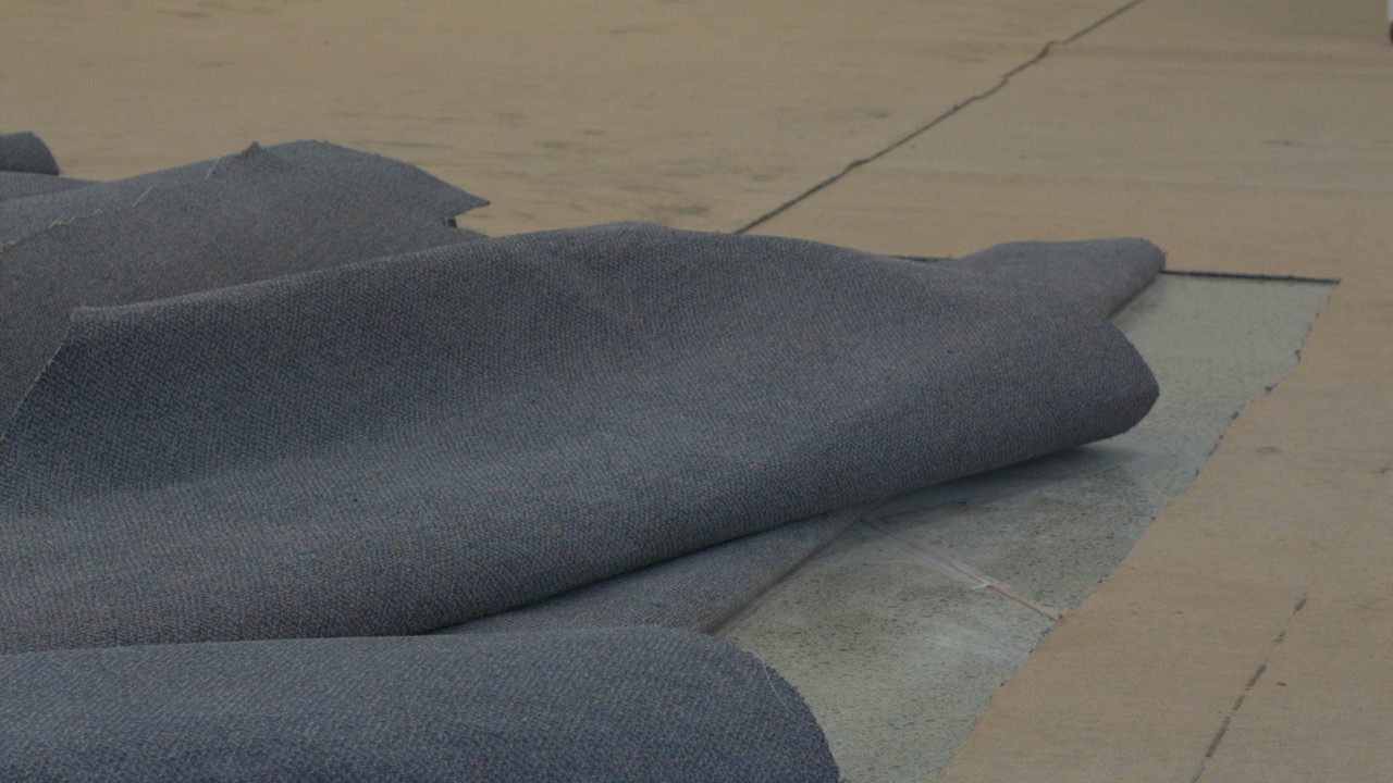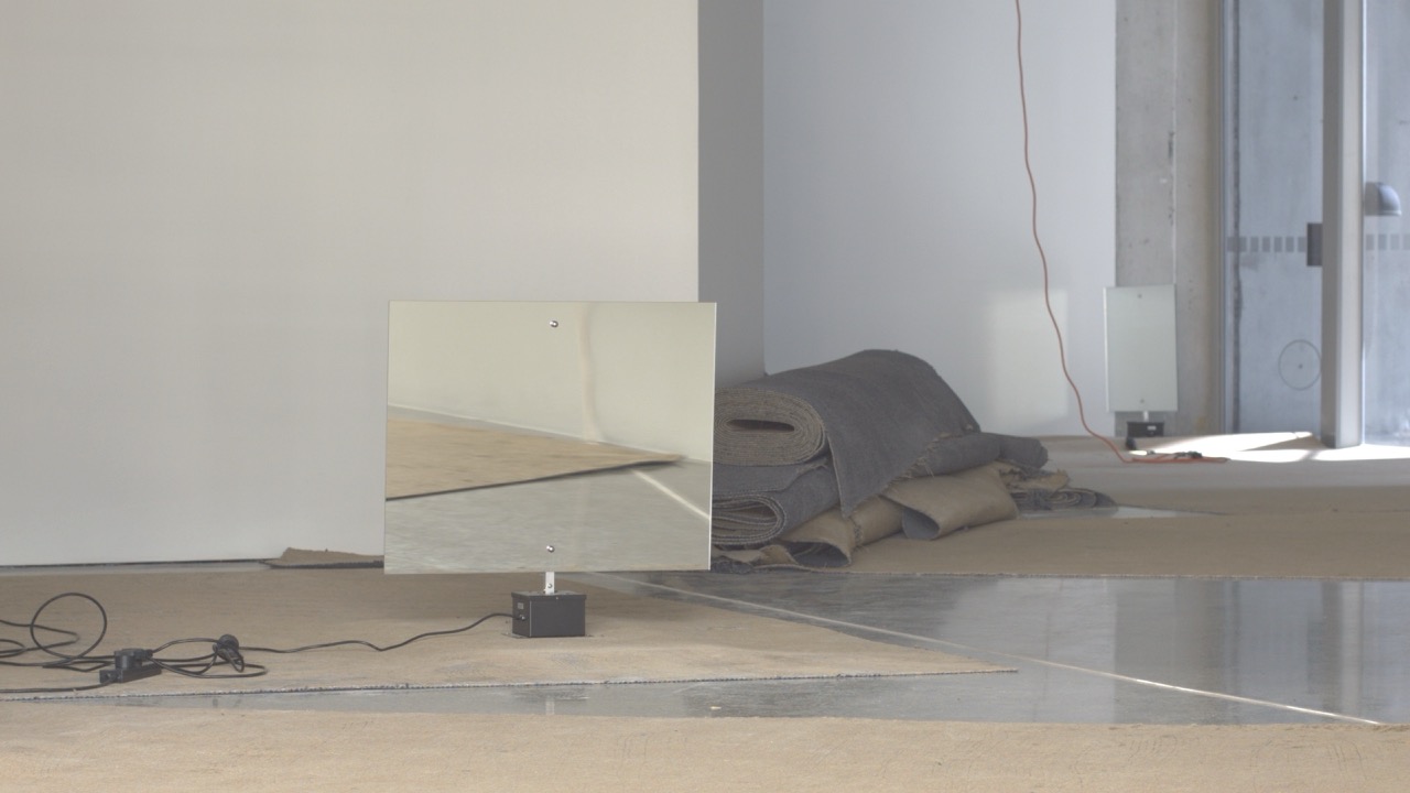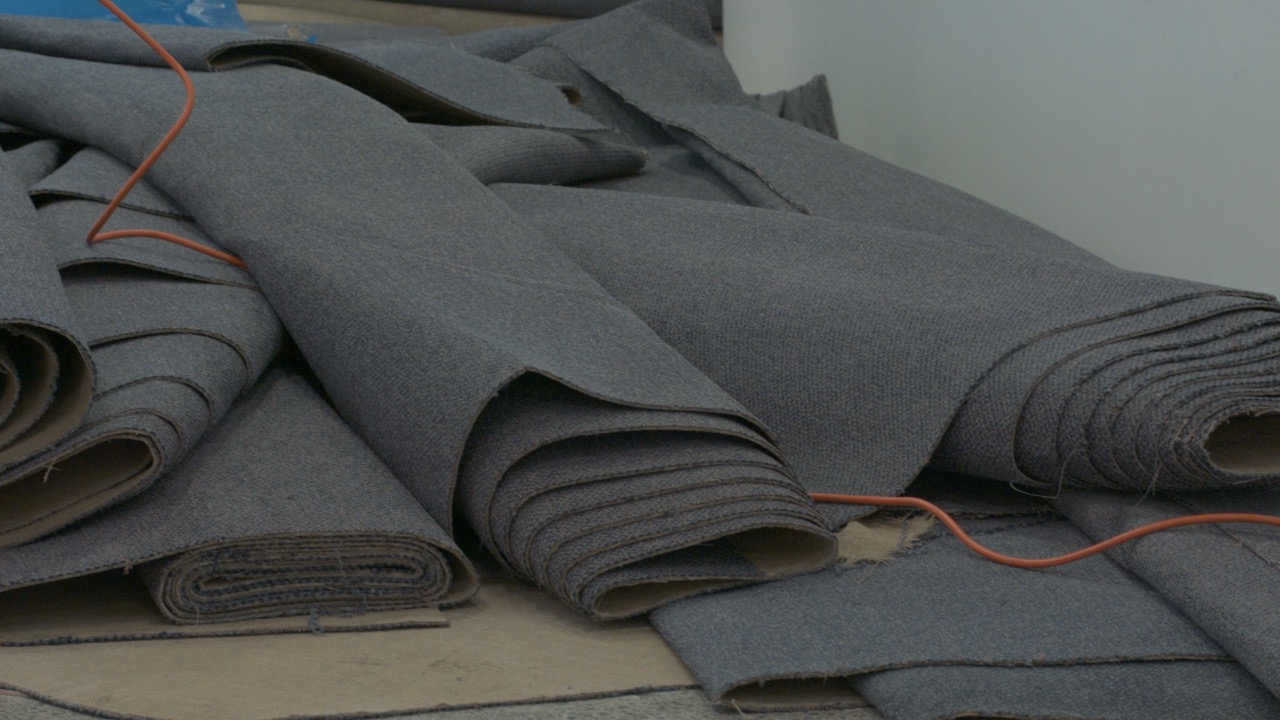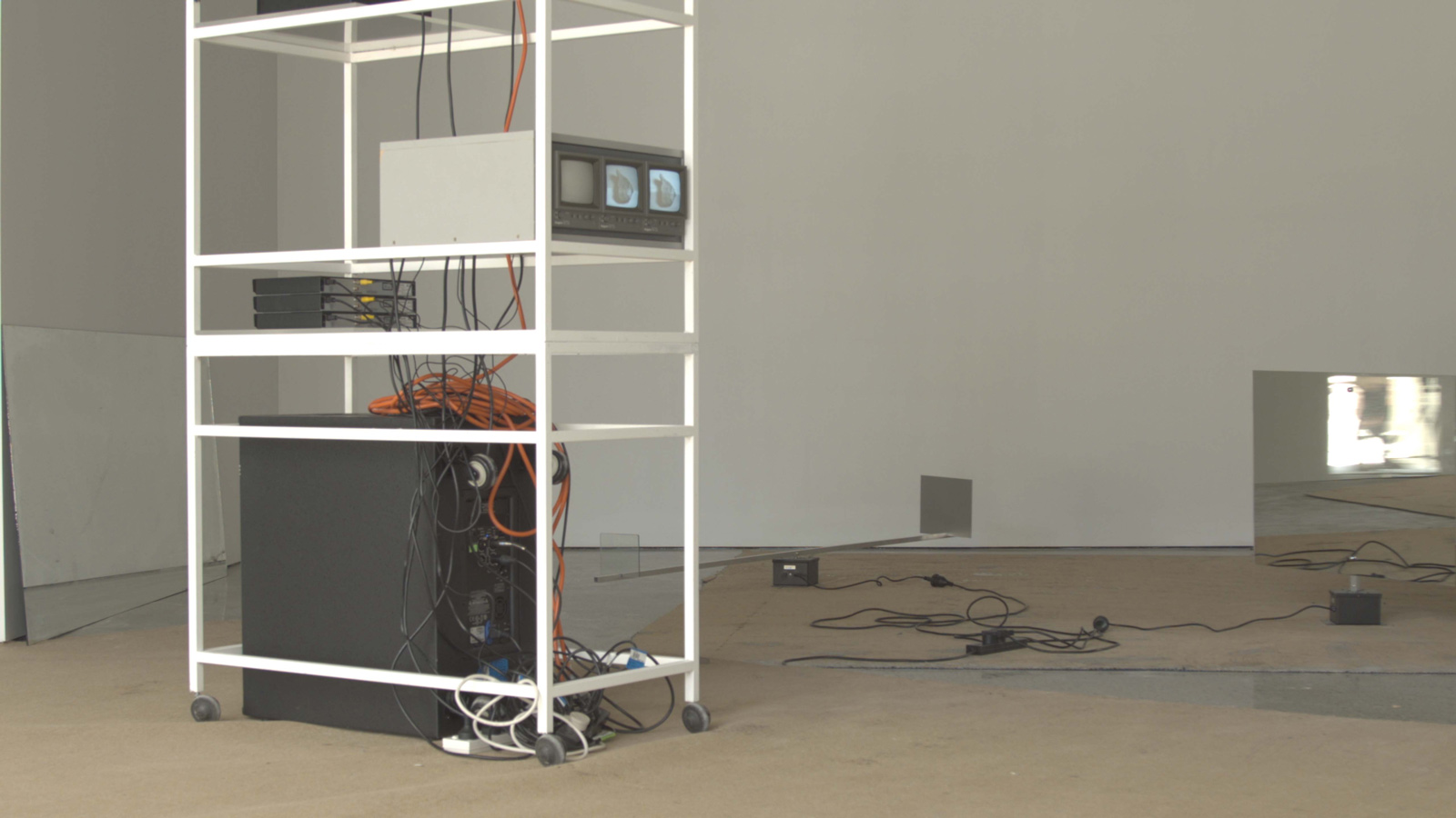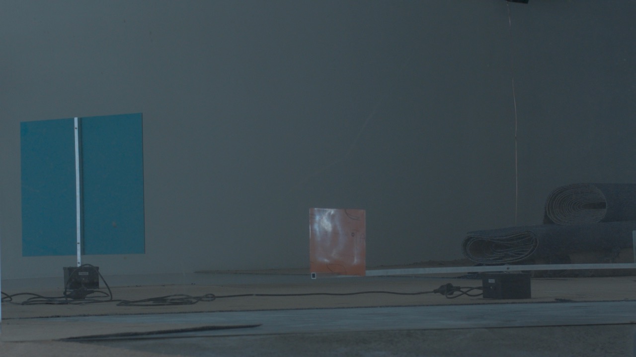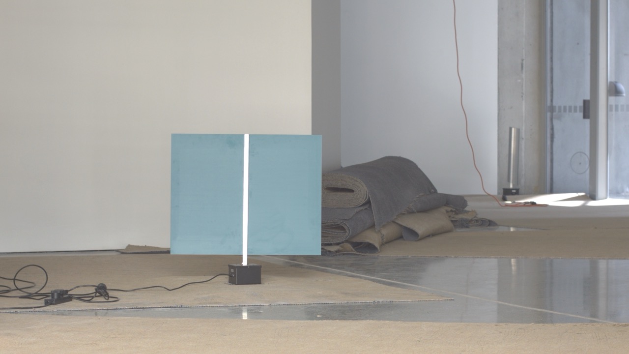 Plastic drop cloth (blue), 12" speakers, Sony Trinitron CRT monitor with the work Song (Fantasia) of (on Byrd's) Humpback Whale (Miserere Mihi), for Paine, Turnbull, W. Banks, 2016, 8mm B/W film, sound (20 mins loop), DVD player, slide projectors, B/W negative slide sequence, mounted speakers, speaker wire, perspex, sub-woofer, extension cords (black), extension cords (orange), audio cables, carpet (800m2) installed folded/unfolded/upside-down and un-fixed, three-screen video with the work A Round for Rocks and Stones, 2014, appropriated painting trolleys, gravitational wave data, various filters, oscillators, and audio modulation devices, raspberry pii with custom coding, infra-red sensor, optical sensor, paper, sound archive generated during the installation (with Eamon Edmundson-Wells).