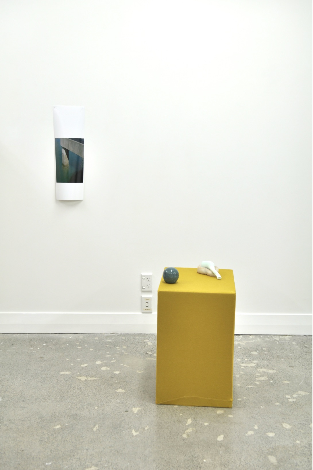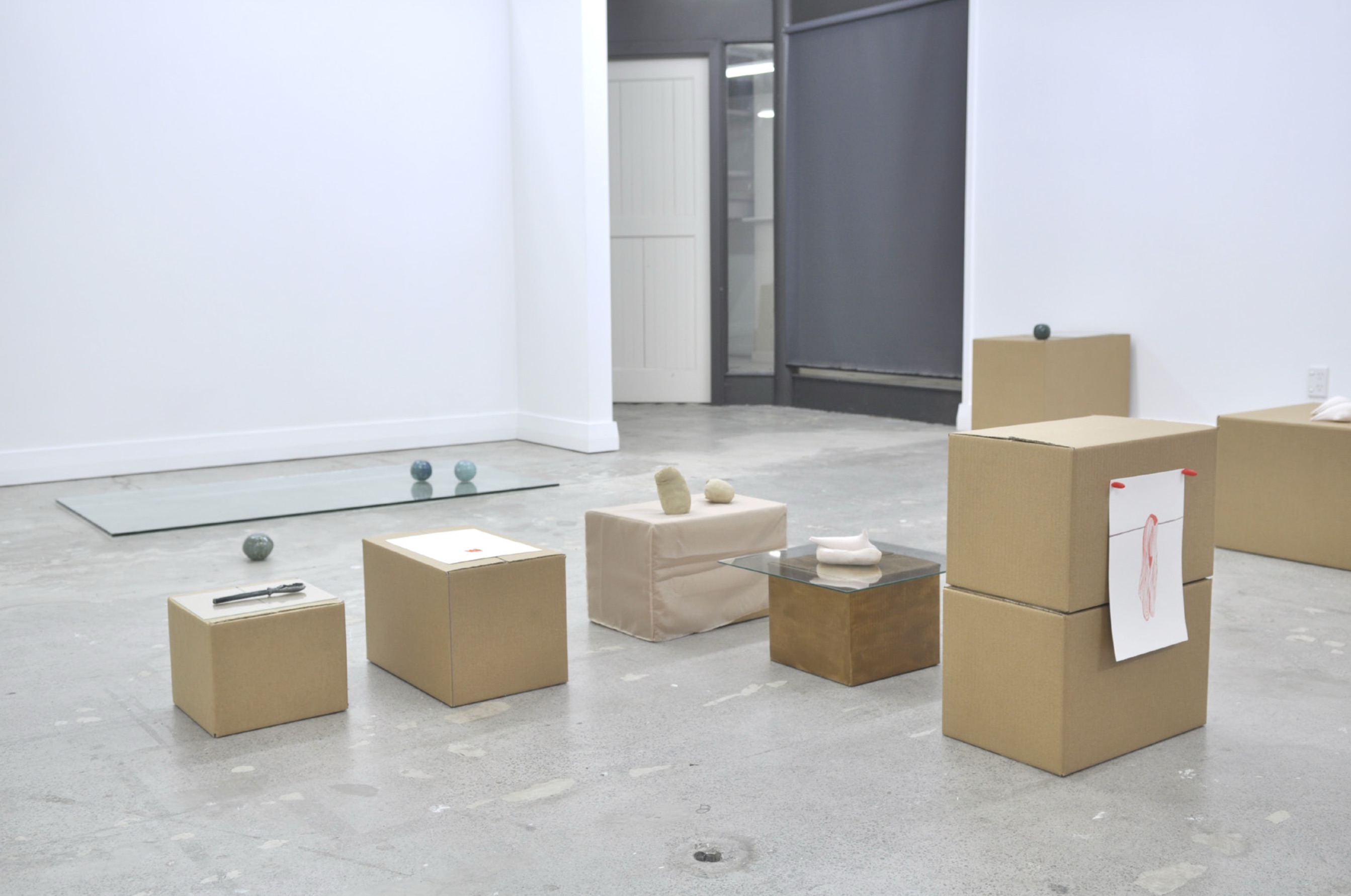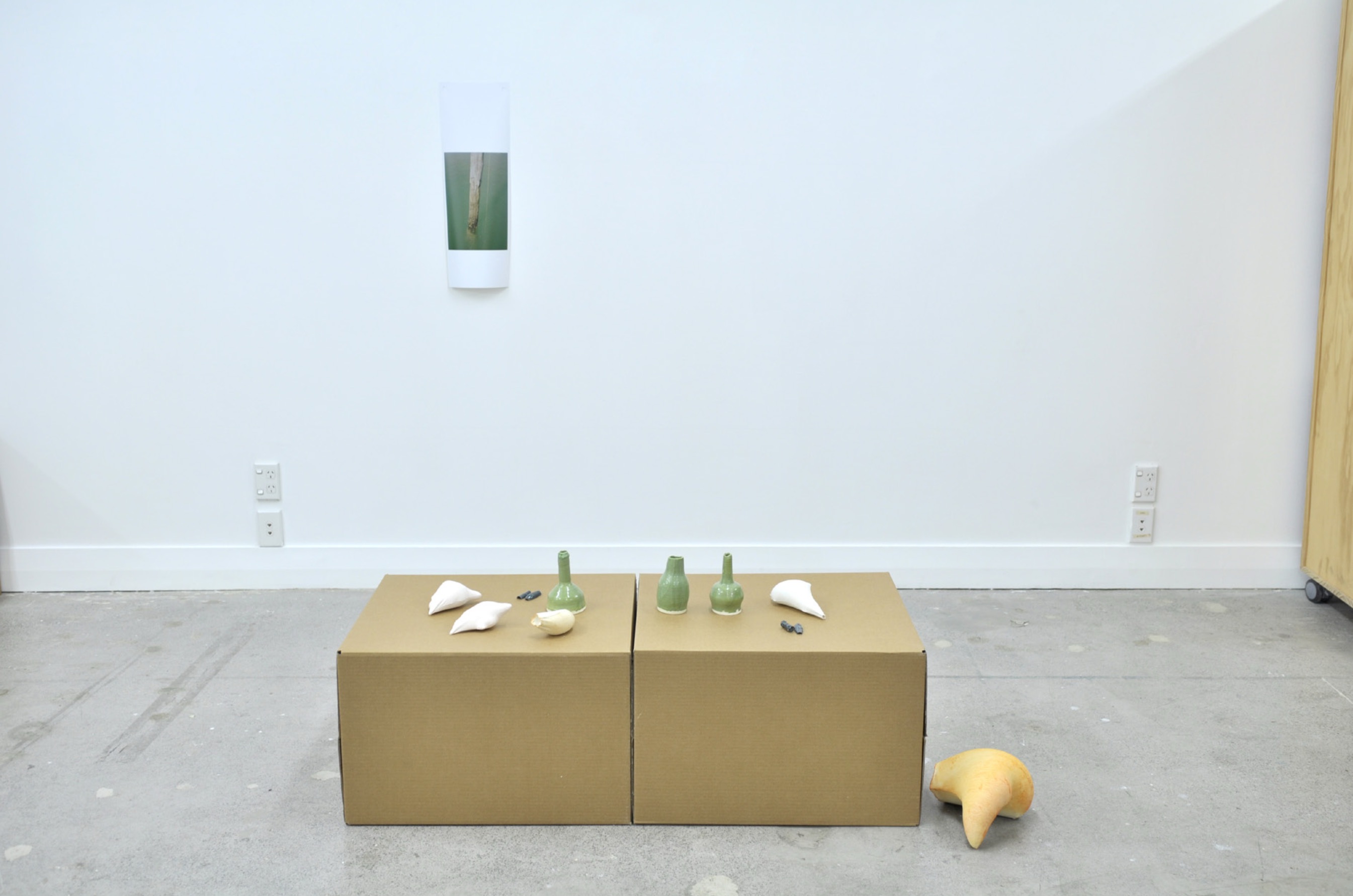UN-MAKING (2013) is a collaborative installation between myself and Philippa Emery, and was first installed at RM gallery on Karangahape Road. The project includes drawings, a variety of plaster casts, slip cast ‘broken pins’, mangrove-like vases, three photographic prints, glass, and cardboard boxes (some with fabric covers as supports) for objects. The objects within UN-MAKING are installed in such as way as to provoke typological connections that are, in turn, frustrated through a lack of classification. This makes for an extended archive of connections. Within the installation five ceramic spheres are placed at different points around the gallery. These spheres can operate as waymarkers within the installation in the sense that they physically mark out the installation, potentially leading the viewer to look for them once a repeating pattern is observed. The object’s placement determins the rhythm at which they are revealed. Rhythm within the installation is disturbed by other interweaving waymarkers, creating a complex viewing experience. Adopting the language of the waymarker to provoke an ‘un-making’ where confusion and dislocation are major considerations in the work. Thus, serendipitous associations to colour, scale and support destabilise the logical typological structure. Accordingly, codes develop and disassemble. UN-MAKING marks a shift of focus within my practice from the narrative pursuit of a site or history towards a series of questions regarding subjective experience within an archive-as-installation.