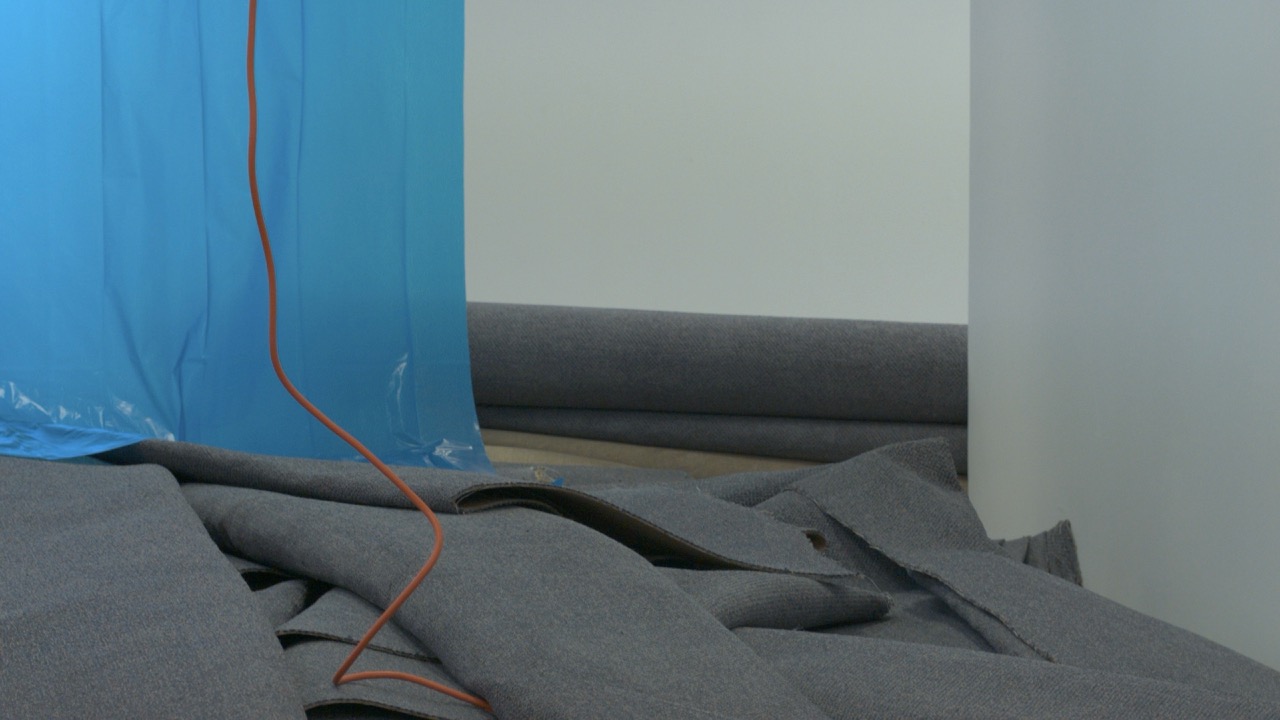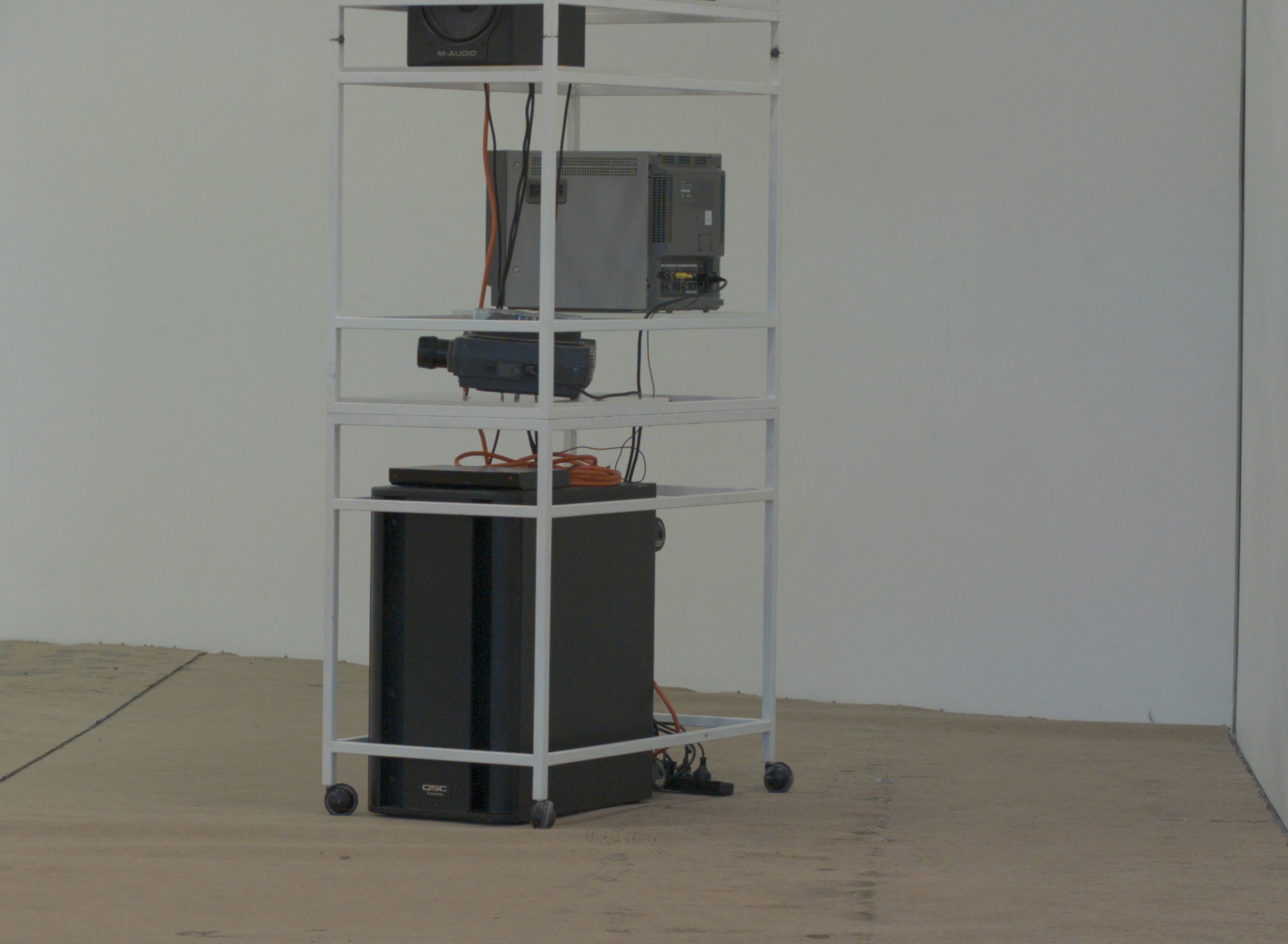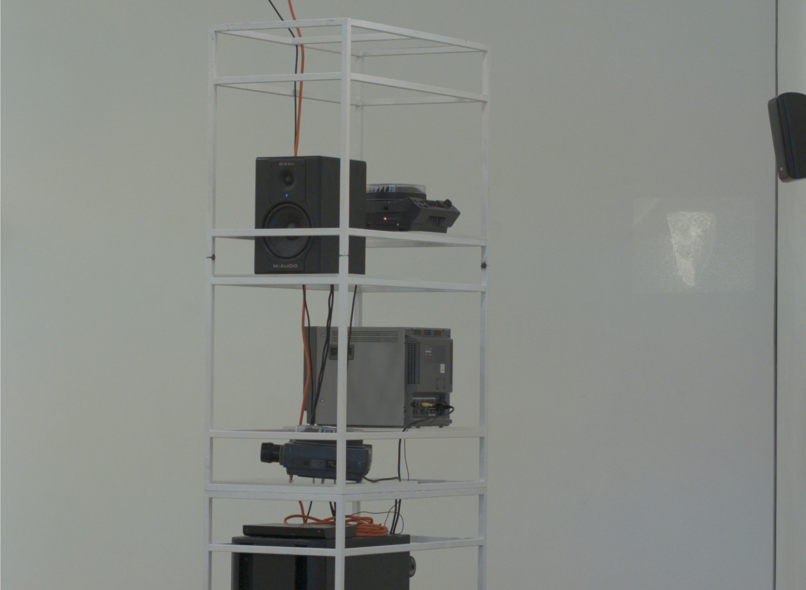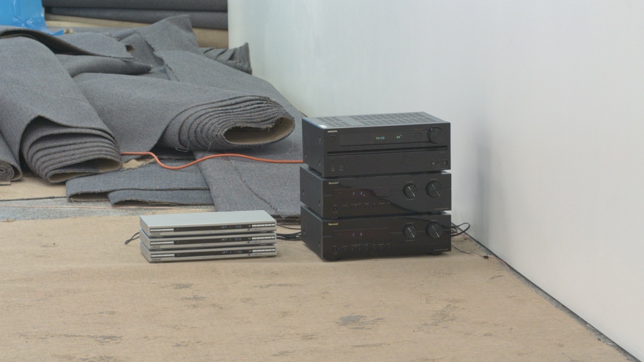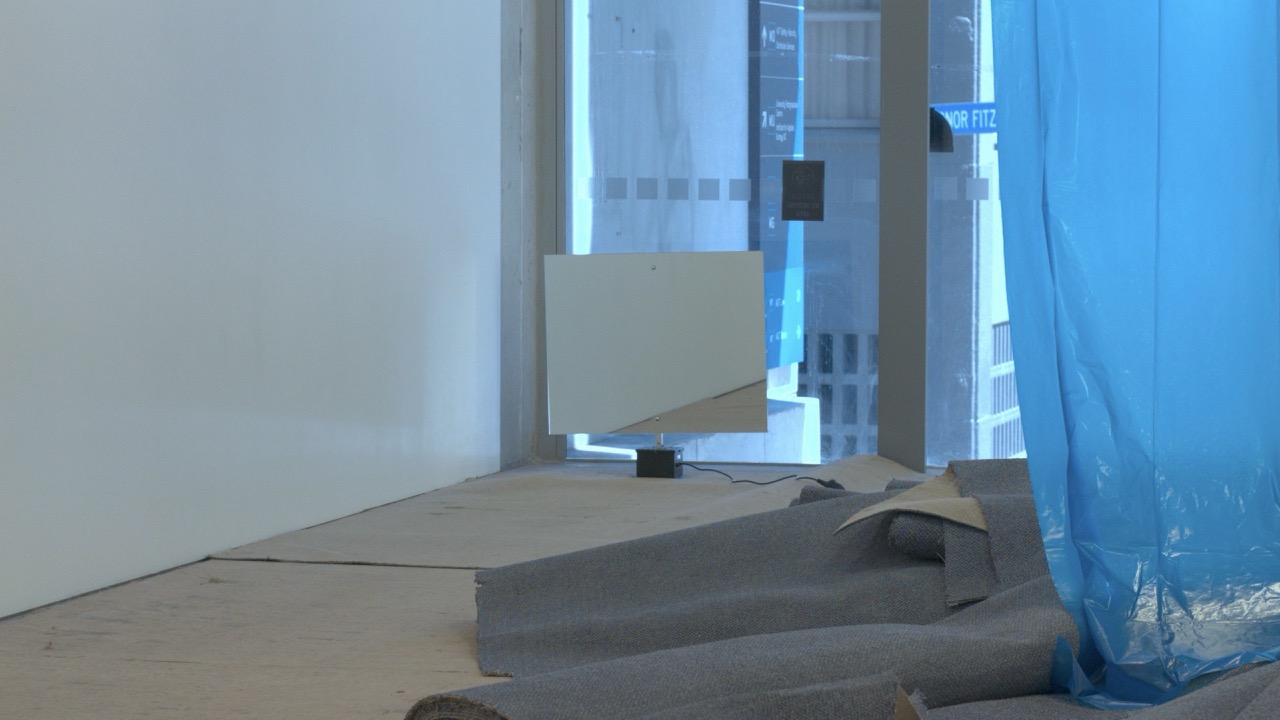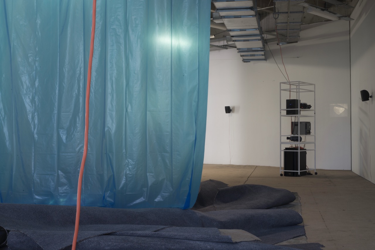 Plastic drop cloth (blue), 12" speakers, Sony Trinitron CRT monitor with the work Song (Fantasia) of (on Byrd's) Humpback Whale (Miserere Mihi), for Paine, Turnbull, W. Banks, 2016, 8mm B/W film, sound (20 mins loop), DVD player, slide projectors, B/W negative slide sequence, mounted speakers, speaker wire, perspex, sub-woofer, extension cords (black), extension cords (orange), audio cables, carpet (800m2) installed folded/unfolded/upside-down and un-fixed, three-screen video with the work A Round for Rocks and Stones, 2014, appropriated painting trolleys, gravitational wave data, various filters, oscillators, and audio modulation devices, raspberry pii with custom coding, infra-red sensor, optical sensor, paper, sound archive generated during the installation (with Eamon Edmundson-Wells).