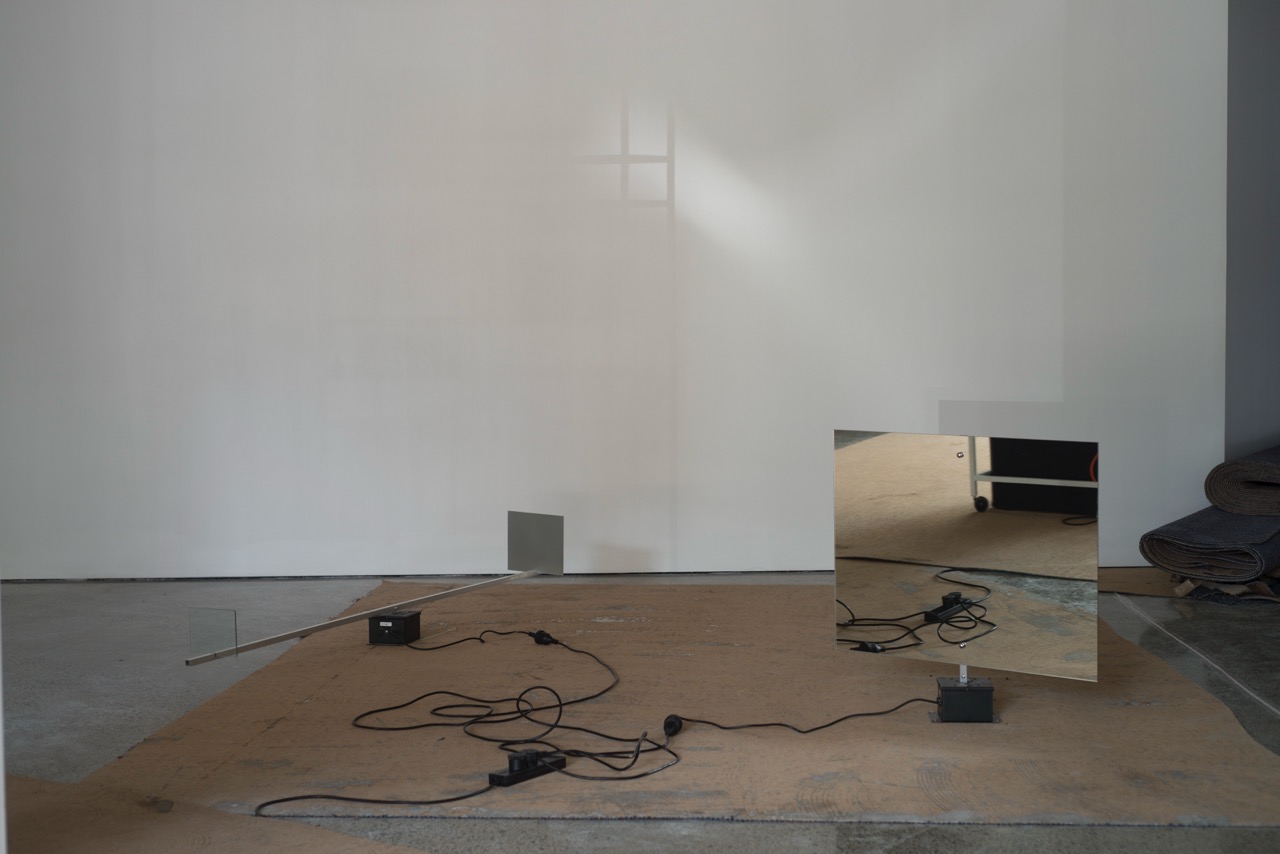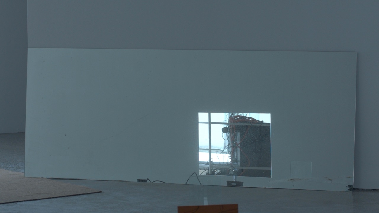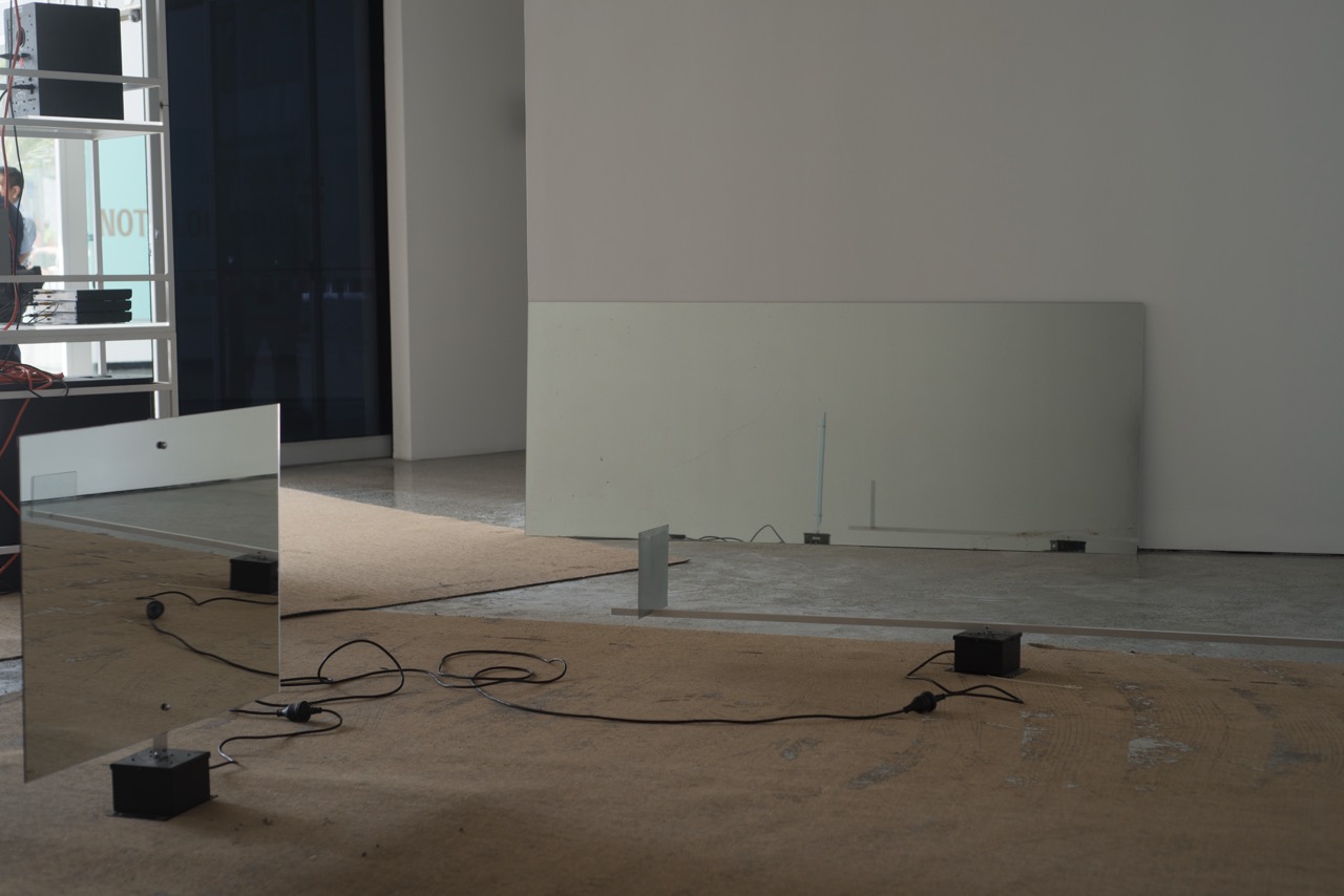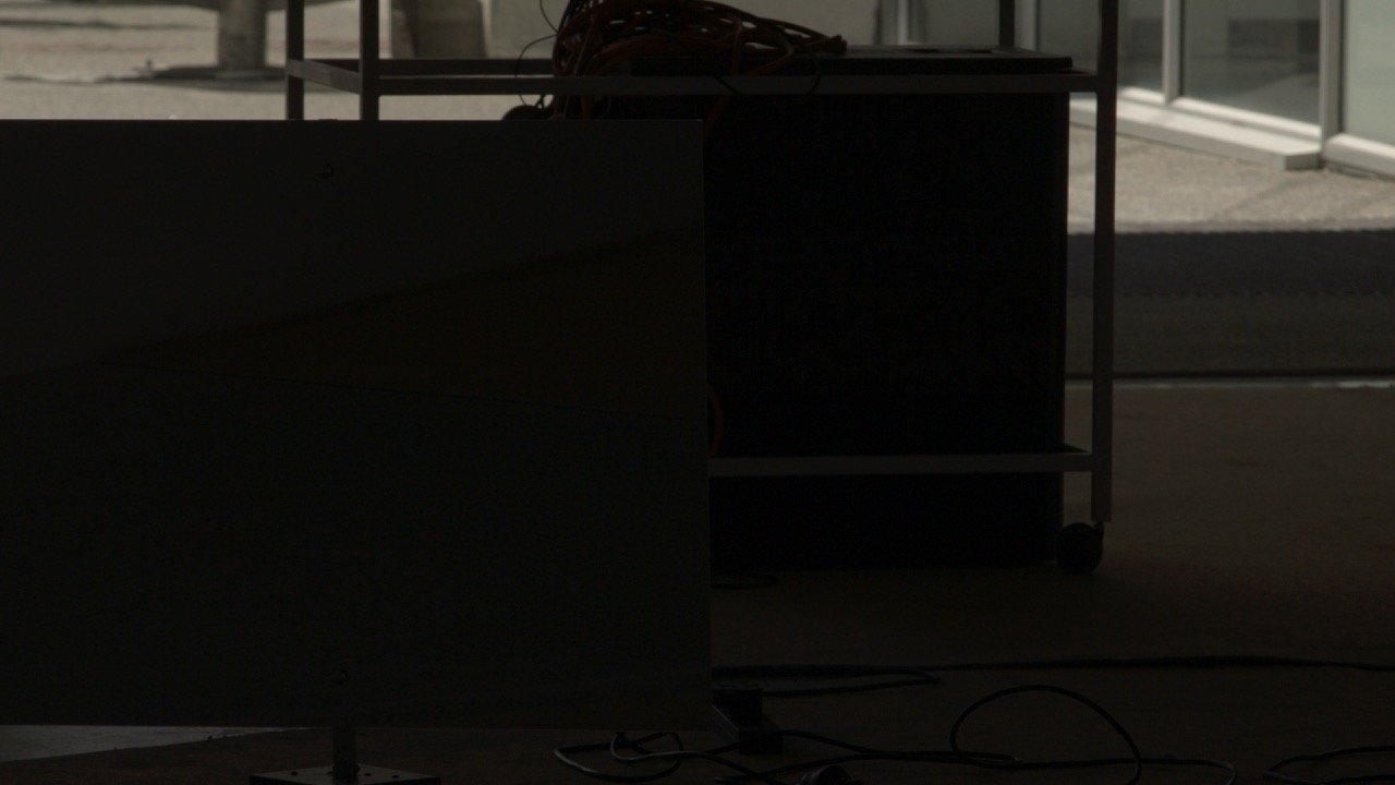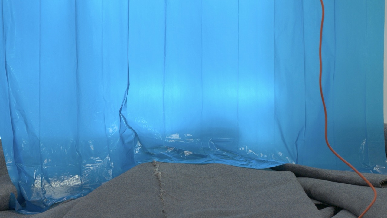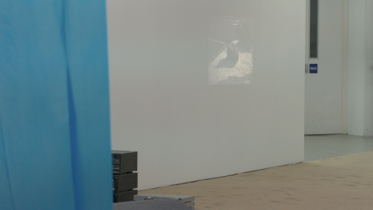 Plastic drop cloth (blue), 12" speakers, Sony Trinitron CRT monitor with the work Song (Fantasia) of (on Byrd's) Humpback Whale (Miserere Mihi), for Paine, Turnbull, W. Banks, 2016, 8mm B/W film, sound (20 mins loop), DVD player, slide projectors, B/W negative slide sequence, mounted speakers, speaker wire, perspex, sub-woofer, extension cords (black), extension cords (orange), audio cables, carpet (800m2) installed folded/unfolded/upside-down and un-fixed, three-screen video with the work A Round for Rocks and Stones, 2014, appropriated painting trolleys, gravitational wave data, various filters, oscillators, and audio modulation devices, raspberry pii with custom coding, infra-red sensor, optical sensor, paper, sound archive generated during the installation (with Eamon Edmundson-Wells).
